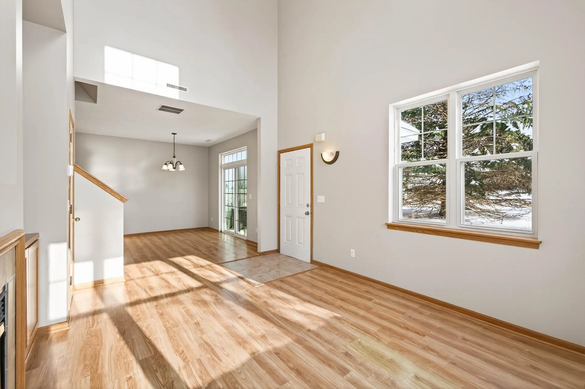Don’t miss out on this Providence Point end-unit beauty close to all the essentials and easy highway access! The private side patio entrance welcomes you to gleaming LVP and tile floors throughout the light and bright open main level featuring a soaring 2-story vaulted ceiling, pedestal sink powder room and a large living room with gas fireplace and beautiful entertainment center built-ins on both sides. Your kitchen boasts an abundance of gorgeous maple cabinets, stainless steel appliances and a closet pantry. New stairway carpet brings you upstairs to a 16 x 12 vaulted primary bedroom with a walk-in closet. The upper level walk-through full bath features 2 sinks, jetted tub and a separate walk-in shower. The upstairs is complete with a second bedroom and YES, a laundry ROOM (not a closet!). Move in and enjoy peace of mind with: fresh paint throughout, new furnace (2022), water heater (2020). Professionally cleaned! HOA includes sanitation/recycling, water & sewer, lawn care, snow removal, building exterior, hazard insurance, and reserves.