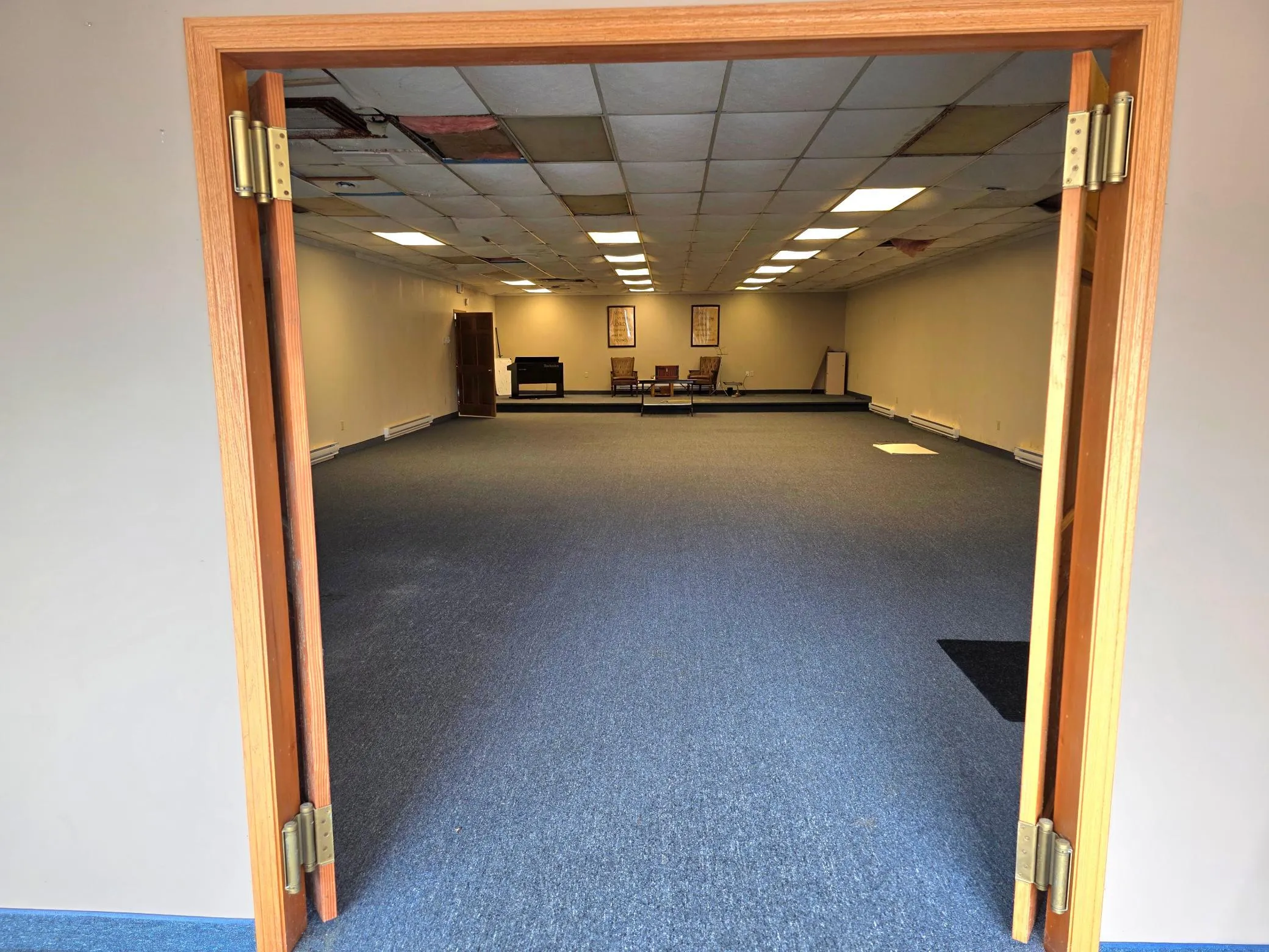 A large, carpeted open space (28’ x 62’) — perfect for gatherings, retail, or work areas