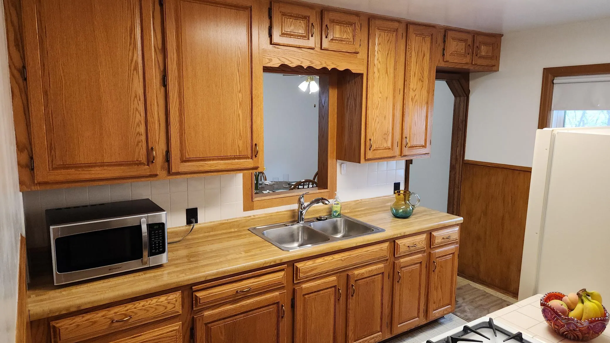 pass-through opening to the dining room, adding charm and functionality. The spacious dining