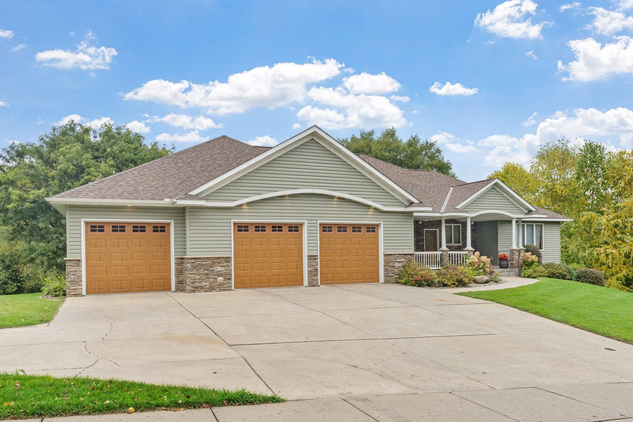 Spacious 4,195 sq ft walkout rambler offering main-level living, wooded privacy, flexible spaces, and exceptional storage on a 0.63-acre lot. The open-concept kitchen features a center island, double wall oven, abundant cabinet storage, built-in desk, breakfast nook, and stainless steel appliances. The living room offers natural light, a stone-surround fireplace, and custom built-ins, while the formal dining room adds versatility for gatherings. A media/flex room on the main level is ideal for home theater, office, or play space. The main-level primary suite features, wooded views, full bath with separate tub and shower, and walk-in closet. A second main-level bedroom plus both a full and a 3/4 bath provide convenient guest or multi-use options. Main-floor laundry with storage adds everyday functionality.