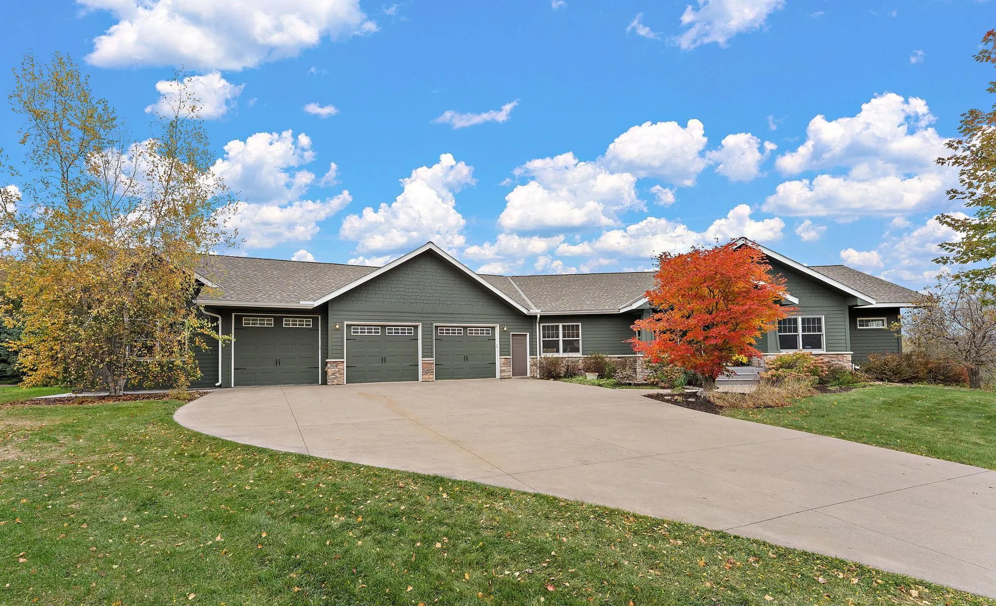 As featured in the 2024 Remodelers Showcase. Completely reimagined, high-end one-level walkout rambler on a private 2.5-acre pond-side setting, blending refined design with everyday function. The main level lives large with 9-ft ceilings and matte hickory floors. A fully remodeled kitchen dazzles with Cambria/Quartz surfaces, Rejuvenation lighting, a statement hood and range, and an oversized walk-in pantry—all oriented to serene pond views and seamless access to the screened porch. Nearby, an expanded mudroom adds custom built-ins and main-floor laundry; a quiet office anchors work-from-home. The spa primary suite features a freestanding soaking tub, tiled walk in shower, dual vanities and in-floor heat. Design details include custom walnut shelving and fresh interior/exterior paint. Outdoor living excels with a maintenance-free screened porch, new deck, under-deck drainage, and two concrete patios, including a hot-tub zone. The luxury heated garage complex + new addition delivers epoxy floors, large doors, pull-down storage, hydraulic lift and shop or EV ready power. Imagine this multi-use space as a home gym, hockey training garage, or extra room for hobbies and projects. A walkout lower level opens to the patio for effortless entertaining. Roof was new in 2022. Minutes to Stillwater amenities with acreage and privacy—a turnkey, designer-finished retreat.