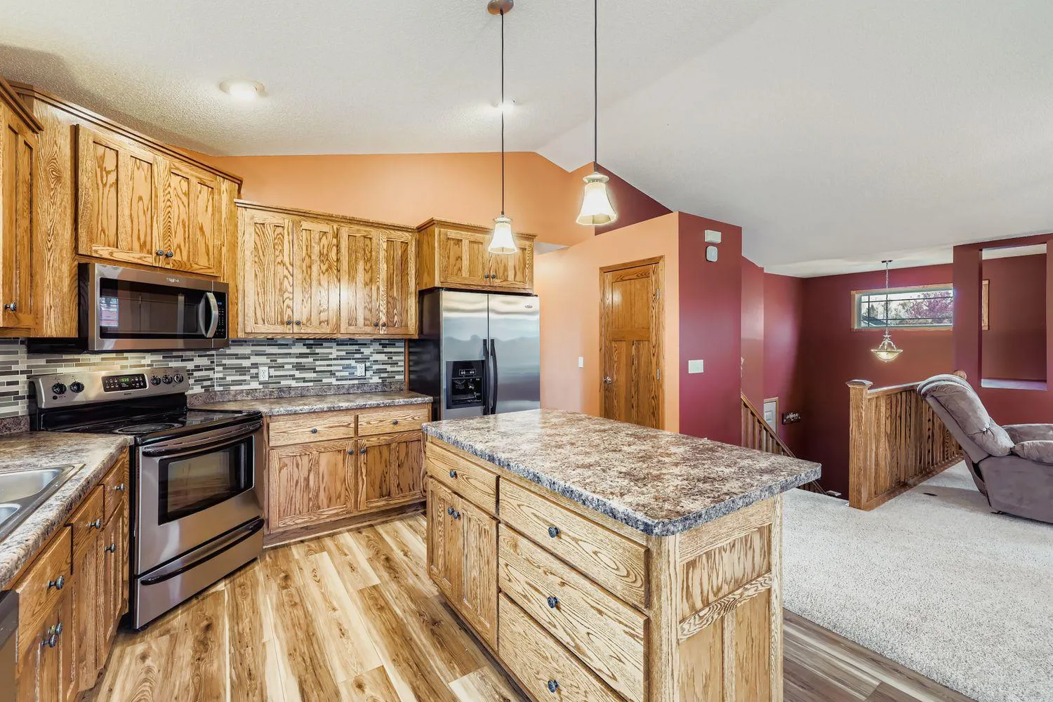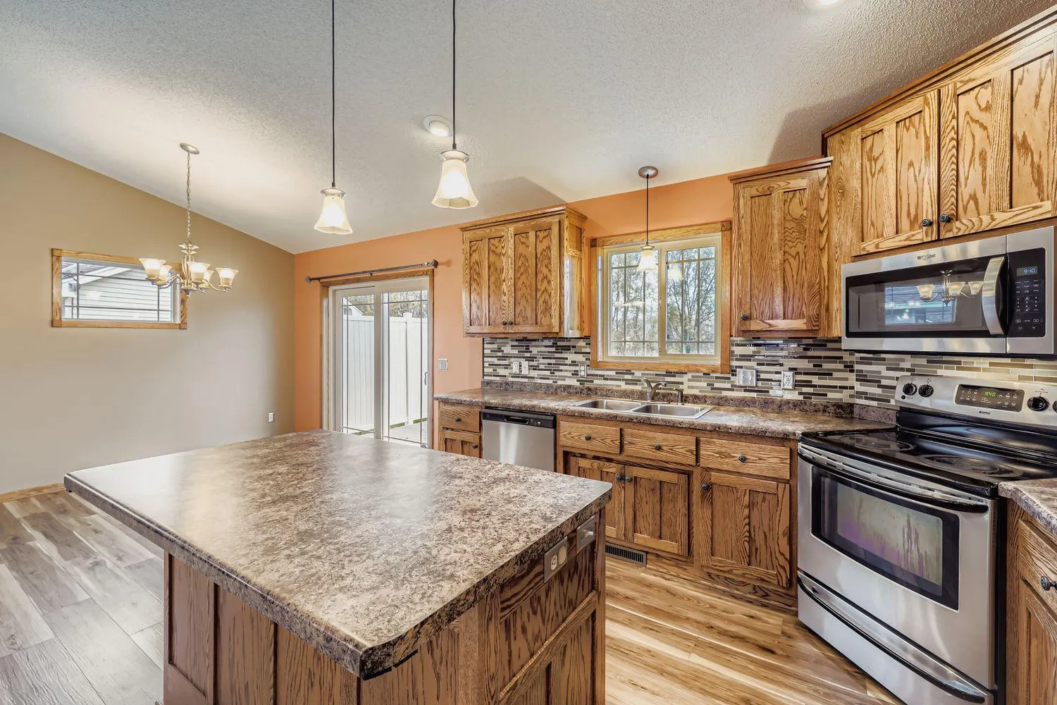Welcome to a warm and inviting 3-bedroom, 3-bath home with the perfect balance of indoor amenities and outdoor living spaces! Lovingly maintained with rich, vibrant color selections, gleaming natural woodwork, soaring vaults, and a cozy gas fireplace. Custom cabinetry and doors boast stunning woodgrain texture, and the walkout lower-level family room and office/library feature built-in bookshelves. Updates include newer roof, kitchen flooring, dishwasher, microwave, and shelving in the laundry room. Outdoor gathering spaces include a sizeable deck and patio overlooking the generous expanse of a fully fenced yard with apple trees, dedicated garden plot, and irrigation system. Enjoy the open space of the serene wetland providing both privacy and a variety of wildlife. Experience fishing, boating, and tubing on the scenic Rum River nearby. The beautiful city of Isanti checks all the boxes for amenities and services! Nestled into an established neighborhood; paved trails and multiple playgrounds are just steps away. This home is the perfect combination of home and yard, city and country. A short drive to the Twin Cities with a small-town atmosphere. The only thing missing is you!