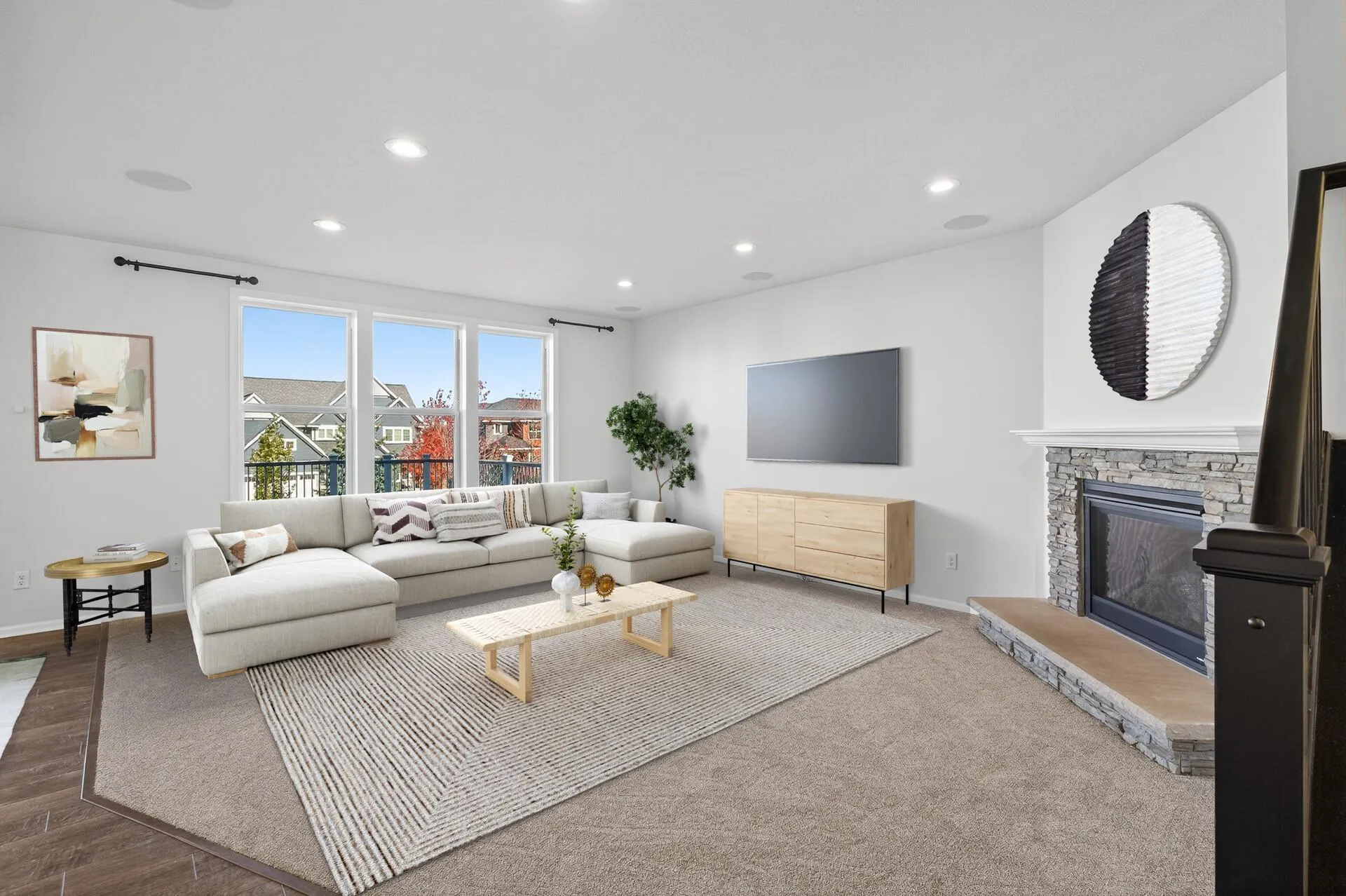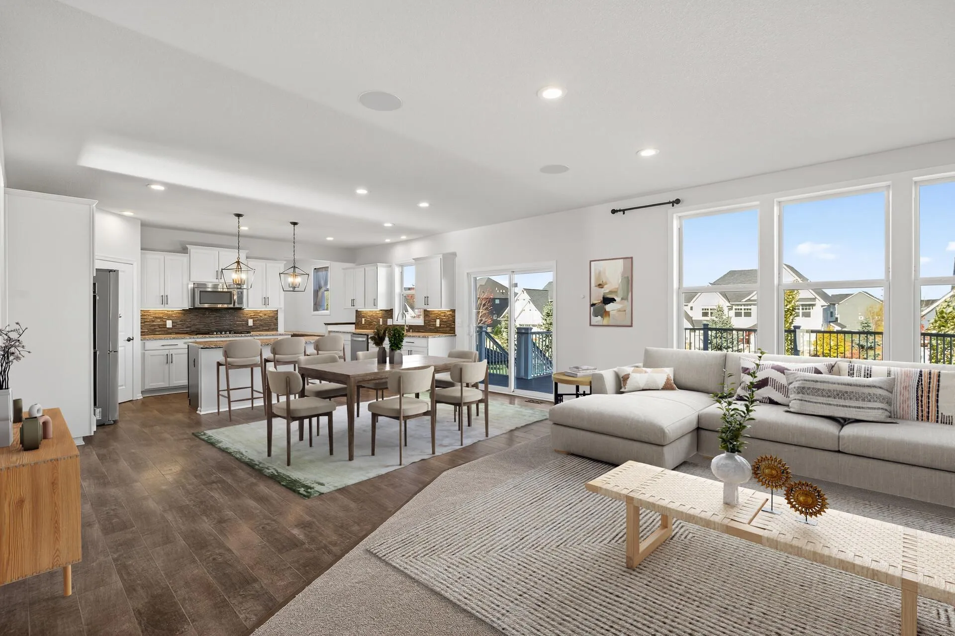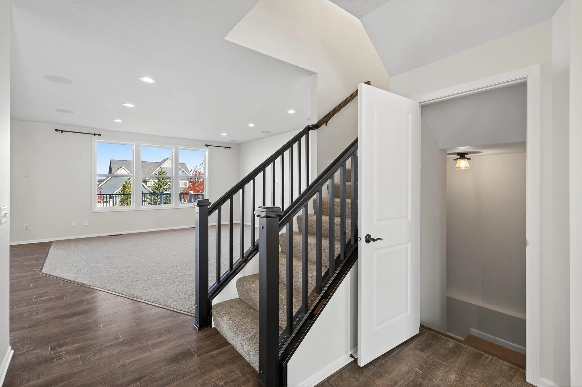Inside, you’ll find fresh interior paint, brand-new carpet, and sun-filled living spaces designed for modern living. The open-concept main level flows seamlessly from the living room to the kitchen and dining area, and includes a private main-floor office, perfect for working from home or quiet study time.