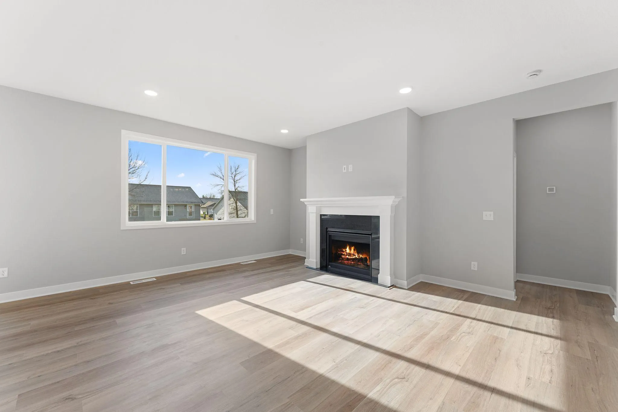 Relax in the inviting great room, anchored by a gas fireplace with a site-finished Kenwood surround painted in SW 7005 Pure White, an absolute black granite face, and a flush hearth — perfect for cozy nights in.
