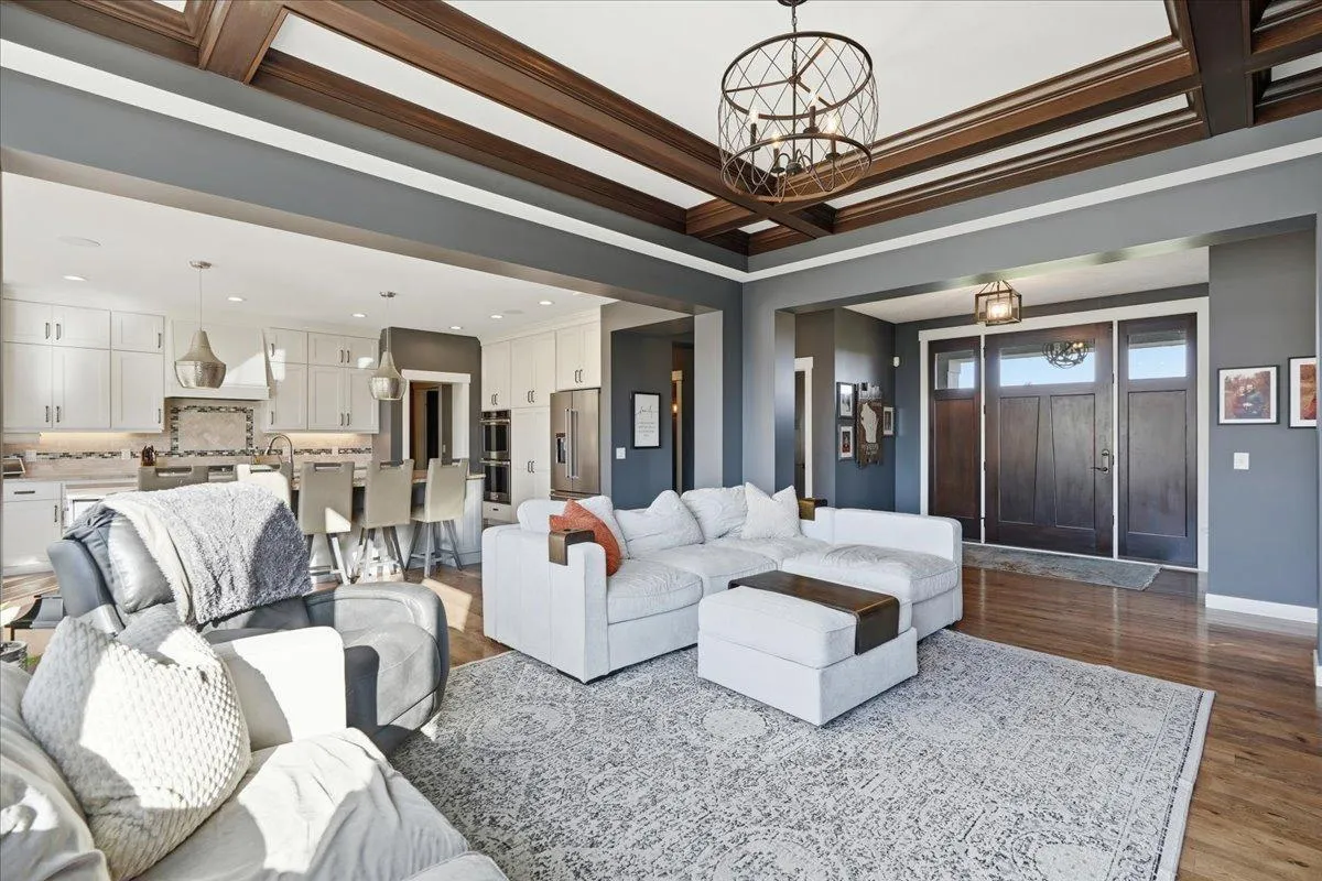 Nestled on a private lake, this stunning 4-bedroom, 4-bath home offers the perfect blend of luxury, comfort, and breathtaking views. Every detail has been thoughtfully designed with high-end finishes and exceptional craftsmanship throughout. Step through the grand front door and into the impressive living room, featuring coffered ceilings, a cozy gas fireplace, and panoramic views of the lake. Adjacent to the living room is a show-stopping kitchen complete with a massive center island topped with granite countertops, stainless steel appliances including a double oven and cooktop with overhead exhaust, and an expansive butler’s pantry offering ample storage and prep space. Just off the kitchen, the dining room provides yet another incredible lake view, while the adjoining three-season porch—with its own fireplace—creates the perfect setting to relax or entertain year-round. A spacious mudroom connects to the finished and heated 4-car garage, providing convenience and functionality. An elegant office and a stylish half bath complete the main level. Upstairs, the luxurious primary suite is a true retreat featuring a spa-like bathroom with a soaking tub overlooking the lake and a walk-in shower. Another bedroom includes a private bathroom, while two additional bedrooms share a beautifully designed Jack and Jill bath. The lower level is unfinished but thoughtfully planned, with rough-ins for an additional bathroom and walkout access to the scenic patio. Outside, you’ll find a backyard oasis—complete with an in-ground pool, lush landscaping, and serene views that make every day feel like a getaway. From the craftsmanship to the setting, this remarkable property delivers the ultimate lakefront living experience.