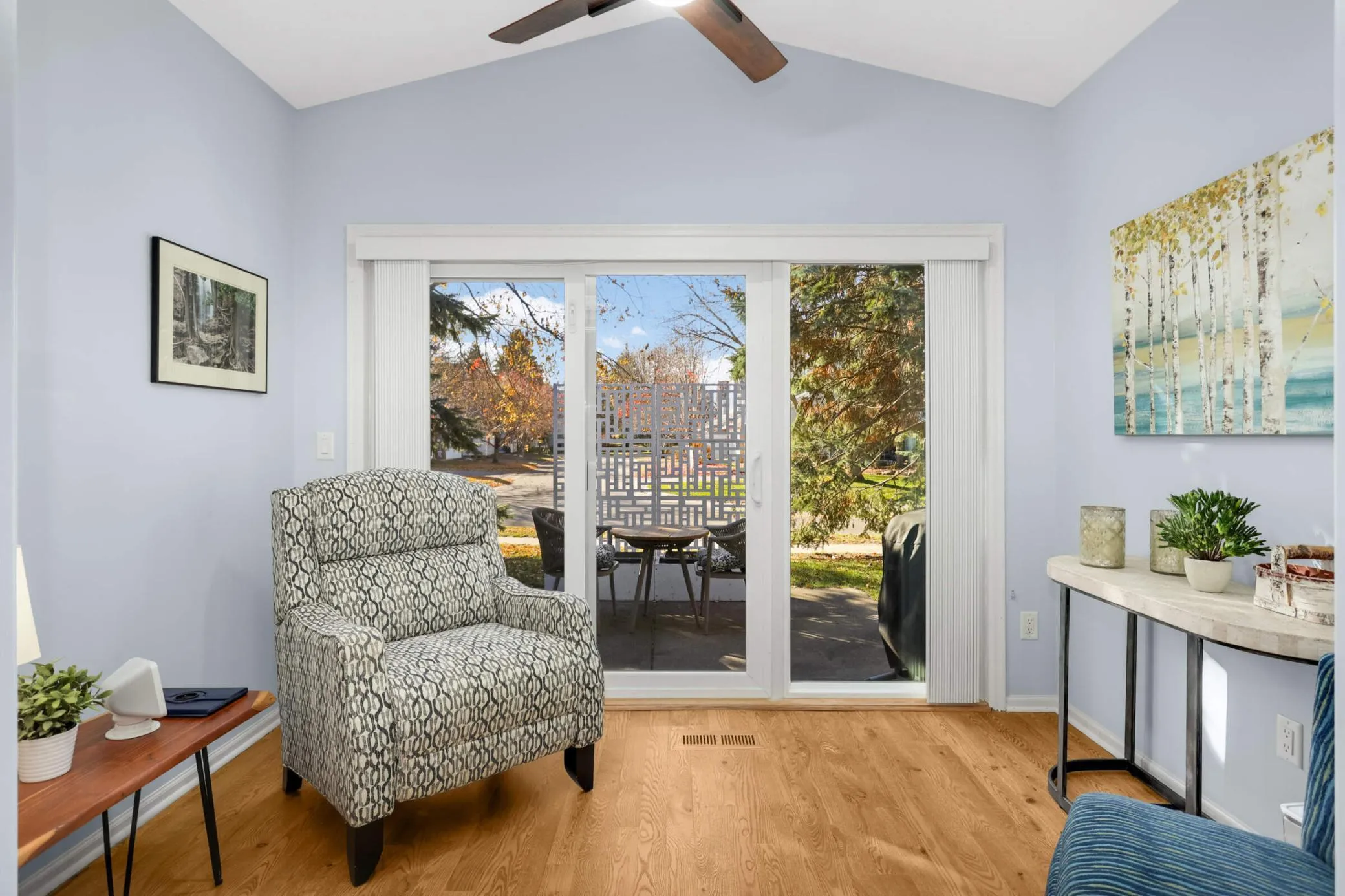 The expansive vaulted living room highlights the refinished hardwood floors and a new temperature-controlled gas fireplace with remote and custom built-ins. French doors open to a sunroom that’s equal parts cozy and functional—perfect for reading, working, or simply relaxing. Step through to your private patio shaded by mature trees and designed for quiet mornings or summer gatherings.