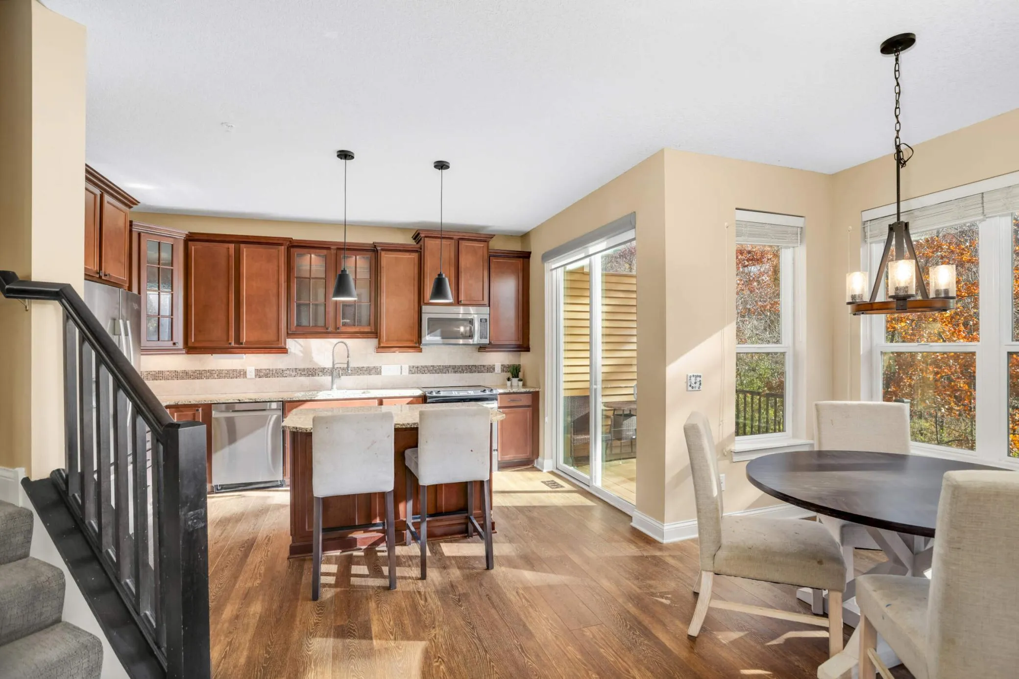 Imagine waking up in a home filled with beautiful natural light, then stepping out onto your deck to enjoy your morning coffee while overlooking the trees and listening to the birds chirping. This spacious end-unit townhome offers private backyard views — you won’t see your neighbors — and perfectly blends comfort, modern style, and easy living in a highly desirable area. The upper level features three bedrooms, including a master suite, a versitile loft, and ample storage. On the main floor, you’ll find a living room, office, a gourmet kitchen, dining area, and a generously sized laundry room. knock down ceilings, recessed lighting, high ceilings and central vacuum provide modern convenience throughout the home. The nicely finished walkout lower level includes a ¾ bathroom and a wet bar with ideal for entertaining or creating a mother-in-law suite and heated floors, perfect for the cold Minnesota winters .Beautiful walking paths, ponds, parks, fishing ponds and entertainment near buy! Come see for yourself!