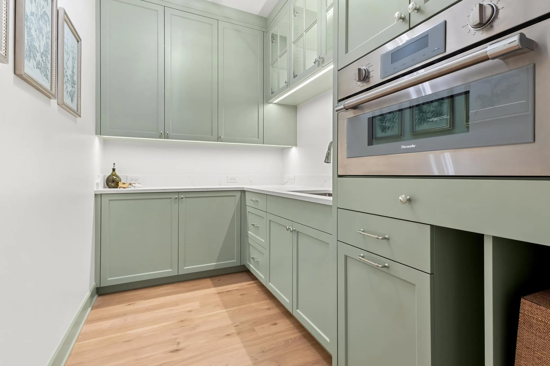 The foyer makes a striking first impression with bold architectural details, opening into sun-filled spaces adorned with wide-plank white oak floors and designer lighting. At the heart of the home, the kitchen balances clean, modern lines with functional elegance—featuring custom cabinetry, high-end Thermador appliances, and a beautifully appointed butler’s pantry.