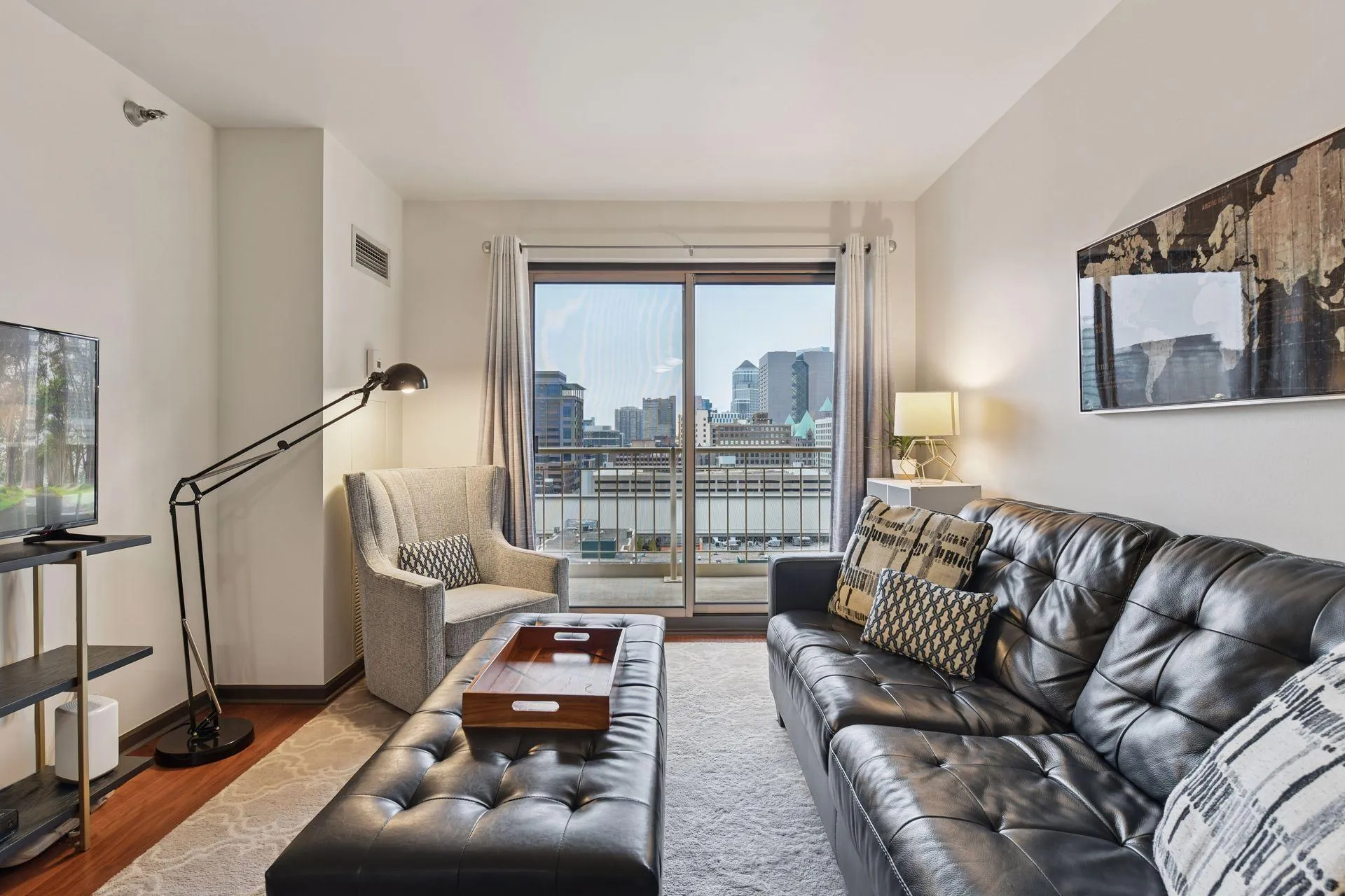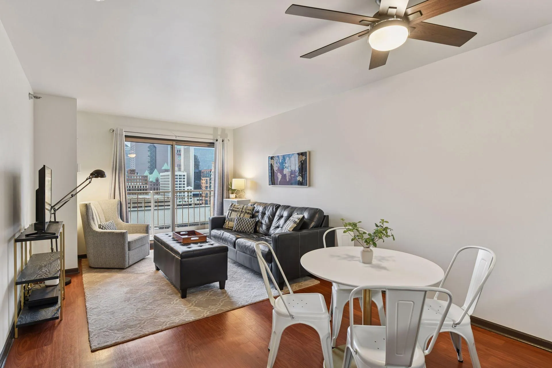 Riverwest amenities include an outdoor pool with lounging areas, fitness center, sauna, whirlpool, outdoor dog space, party room with kitchen, community room, car wash bay, secure package room, indoor guest parking, 24-hour front desk, and on-site maintenance staff available for small jobs. Close to restaurants, grocery stores, theaters, sports venues, and riverfront trails for easy downtown living.