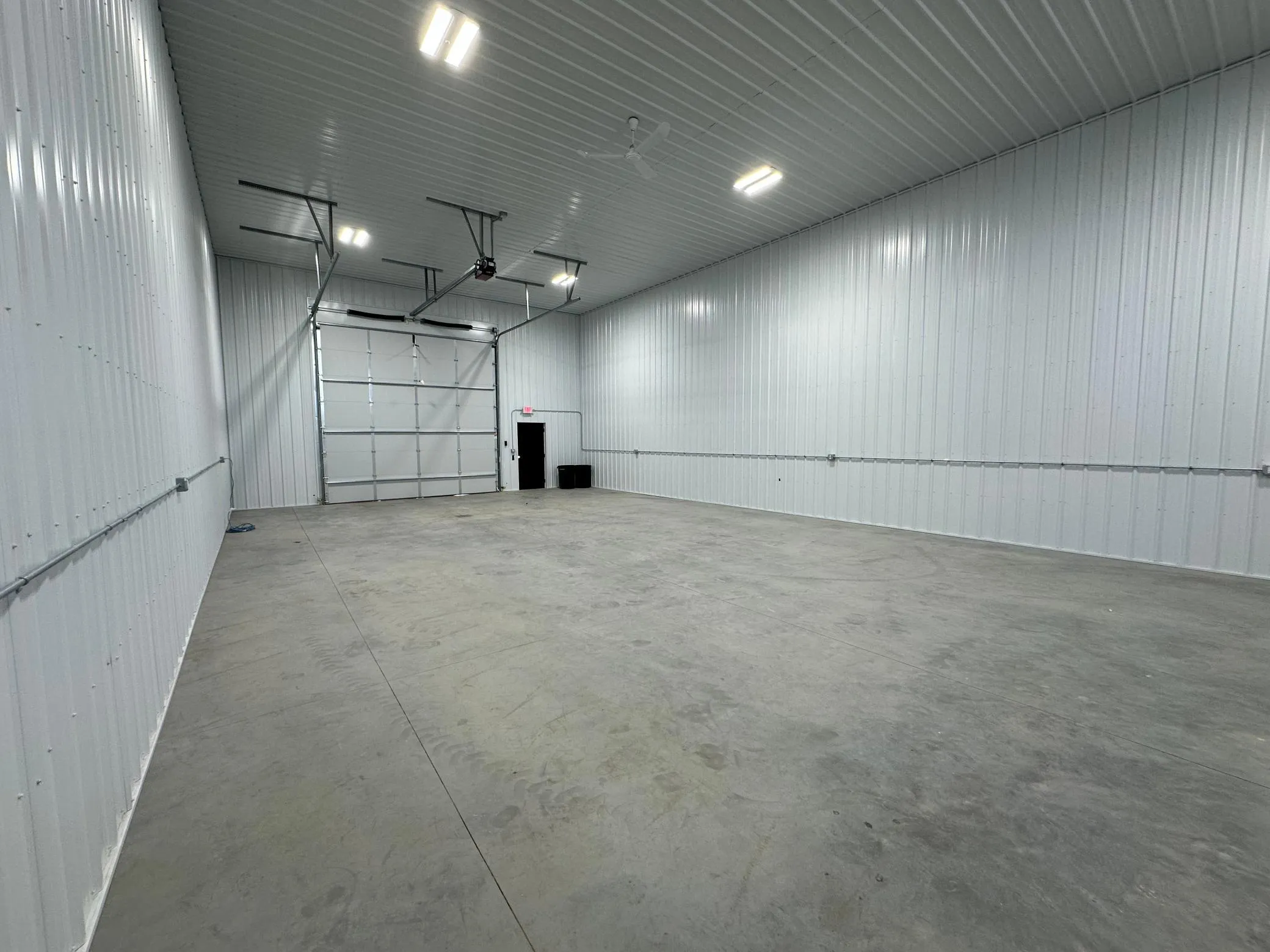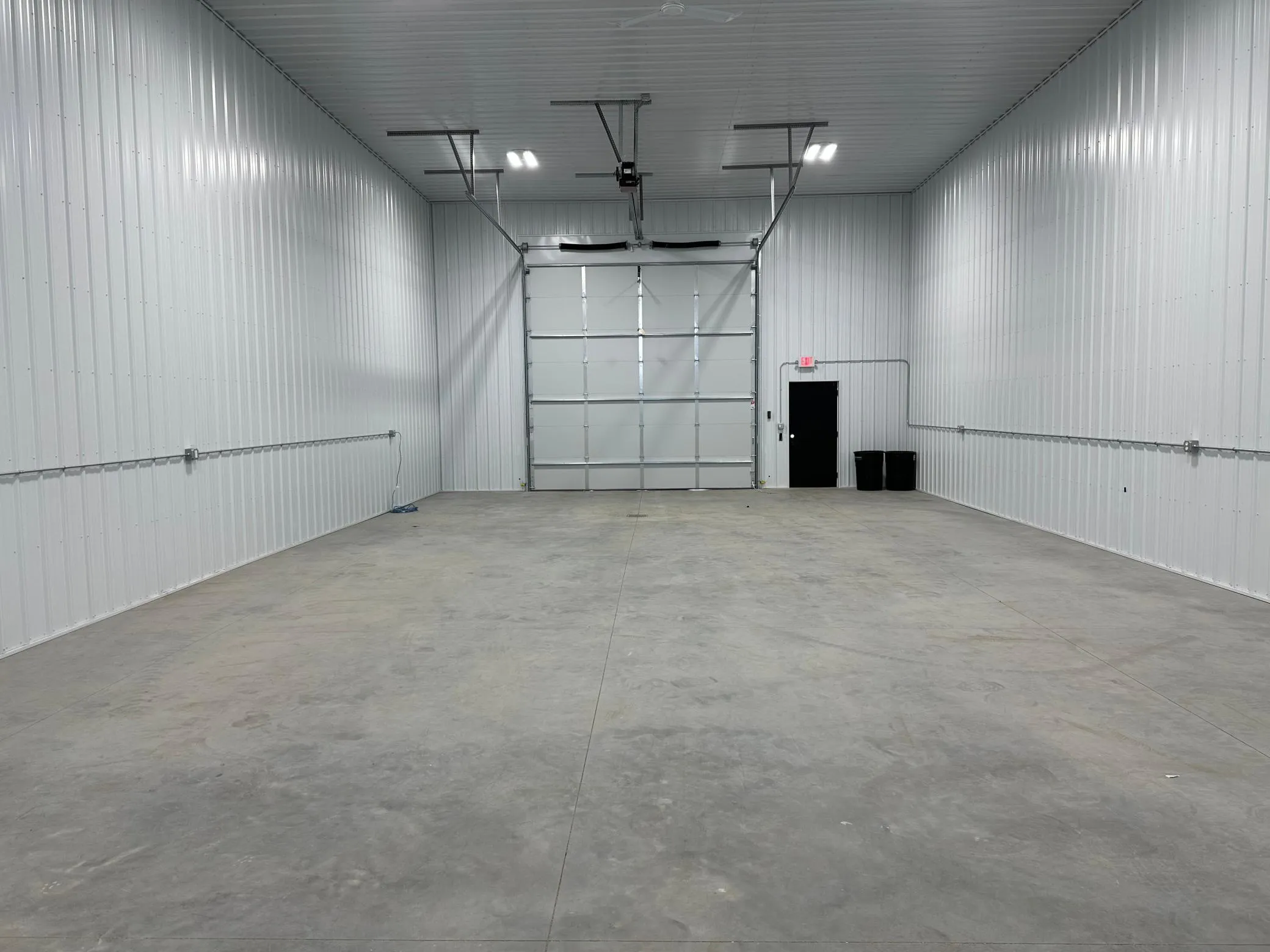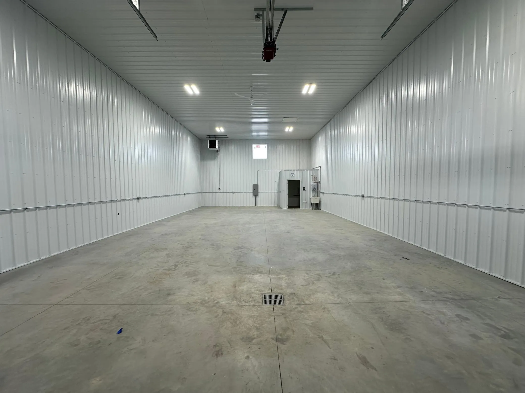 Each unit has steel lined walls, bathroom, floor drain, and natural gas heat. Overhead door openings are 14×14.