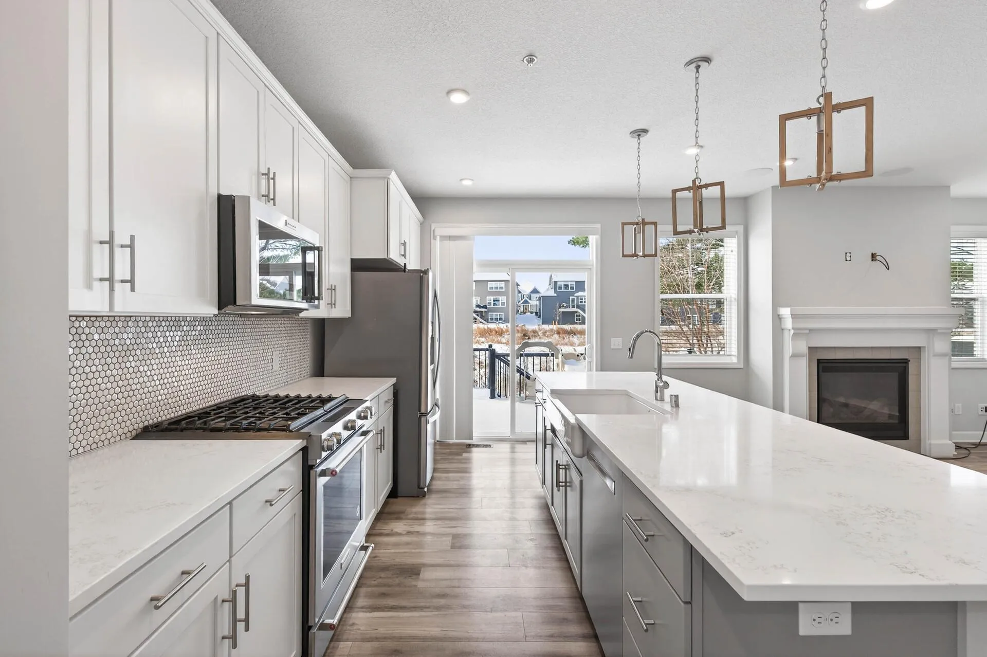 This chic 3 bed/3 bath/2 garage stall end unit townhome has been meticulously maintained and features a gorgeous kitchen with quartz countertops, a generous center island with farm sink, soft-close cabinetry, stainless steel KitchenAid appliances, a spacious owner’s suite with a private 3/4 bath and walk-in closet with new shelving/ storage, and a verdant view from the deck. You’ll love the convenience of an upper level laundry room and all 3 bedrooms on the same level! Fresh paint! The unfinished lower level could be the perfect place to add equity, or use for it’s ample storage space. Check out the “Welcome to the Neighborhood”
