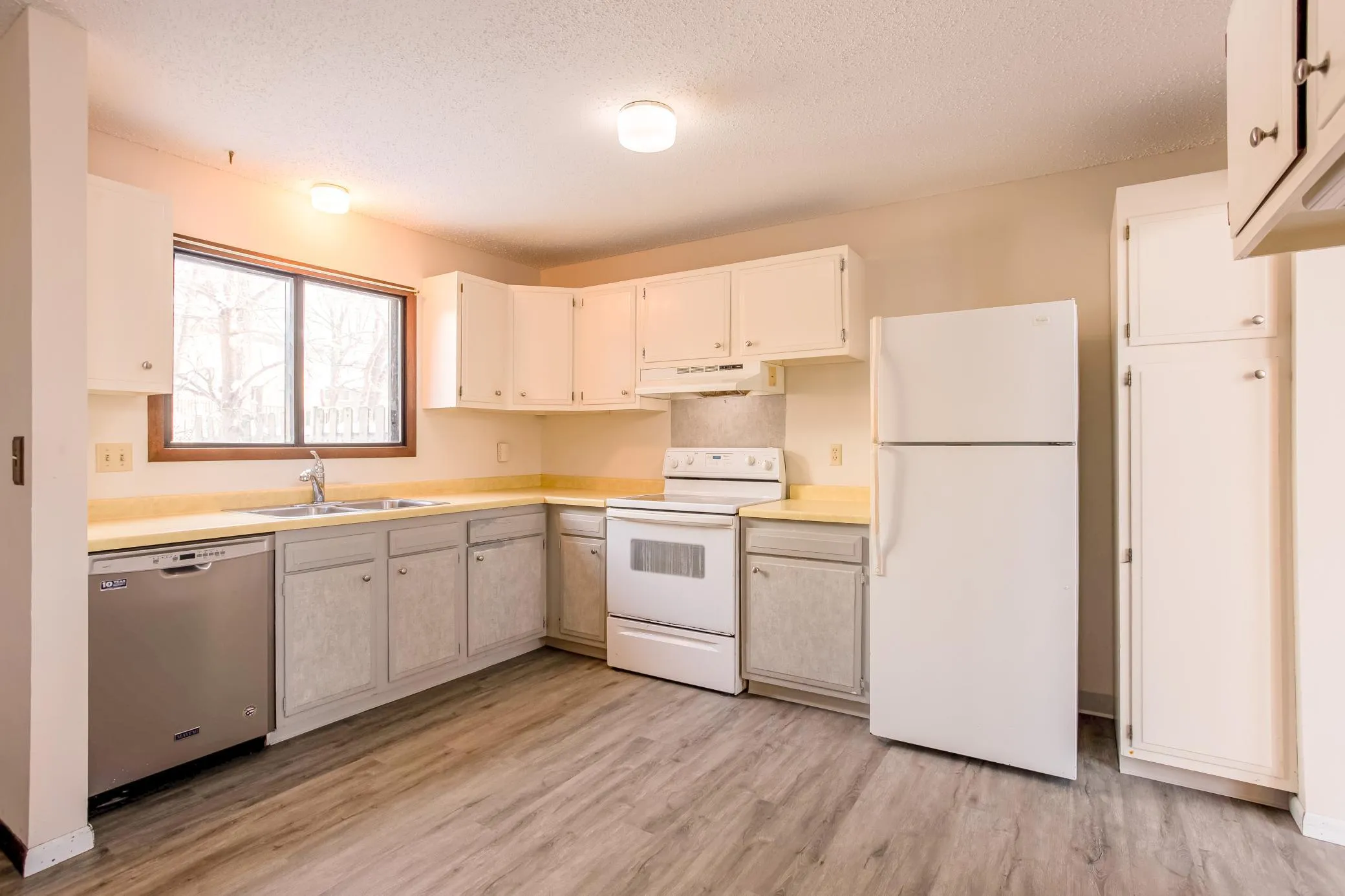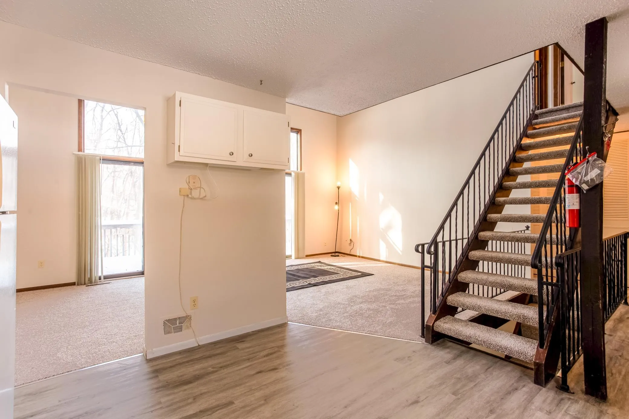 Tucked into a peaceful wooded setting, this distinctive home blends architectural character, abundant natural light, and versatile living spaces with exceptional outdoor areas. The vaulted living room showcases 19’ ceilings with dramatic exposed beams, oversized windows, and dual sliding glass doors that open to a full-width deck – perfect for enjoying the scenic wooded backdrop. The thoughtfully designed kitchen offers ample cabinetry, updated flooring, and a layout that flows seamlessly into the open dining and living areas, making it ideal for both everyday living and entertaining. The main-level primary suite features a spacious walk-in closet with custom built-ins, while a beautifully refinished full bath with tile-surround shower/tub is just steps away. Upstairs, a bright and airy loft provides flexible space for a home office, lounge, or reading nook and offers direct access to a private rooftop terrace above the garage. The upper level also includes a stunning 2nd bedroom with transom windows and exposed beams, a convenient 1/2 bathroom, and additional hallway storage. The expansive unfinished basement presents unlimited potential to customize to your needs—whether as a family room, guest suite, fitness space, or workshop. Recent updates include fresh carpet and flooring throughout, along with a recently painted interior. Located in a quiet, established neighborhood close to parks, trails, and daily conveniences, this home offers timeless charm, thoughtful design, and room to grow – all in a serene natural setting!