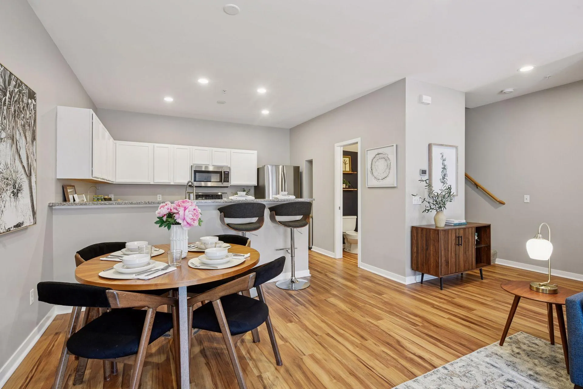 The main level has an open concept layout between living, dining and kitchen, with 9’ ceilings, and bright south-facing windows that bring in natural light. Private second story deck located off the living room. Also on the main level is a nicely finished powder room adjacent to the kitchen. Kitchen with granite countertops, eat-in breakfast bar seating, and plenty of prep and storage space.