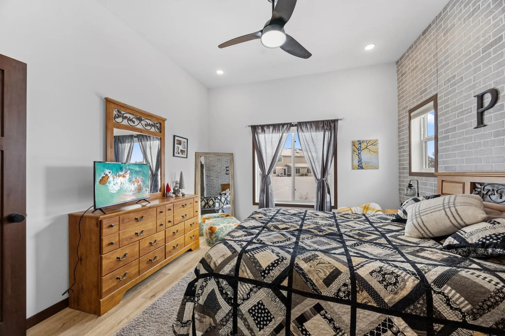 The primary suite blends comfort and style, offering a modern barn-style door, dual sinks, a custom tiled shower with glass