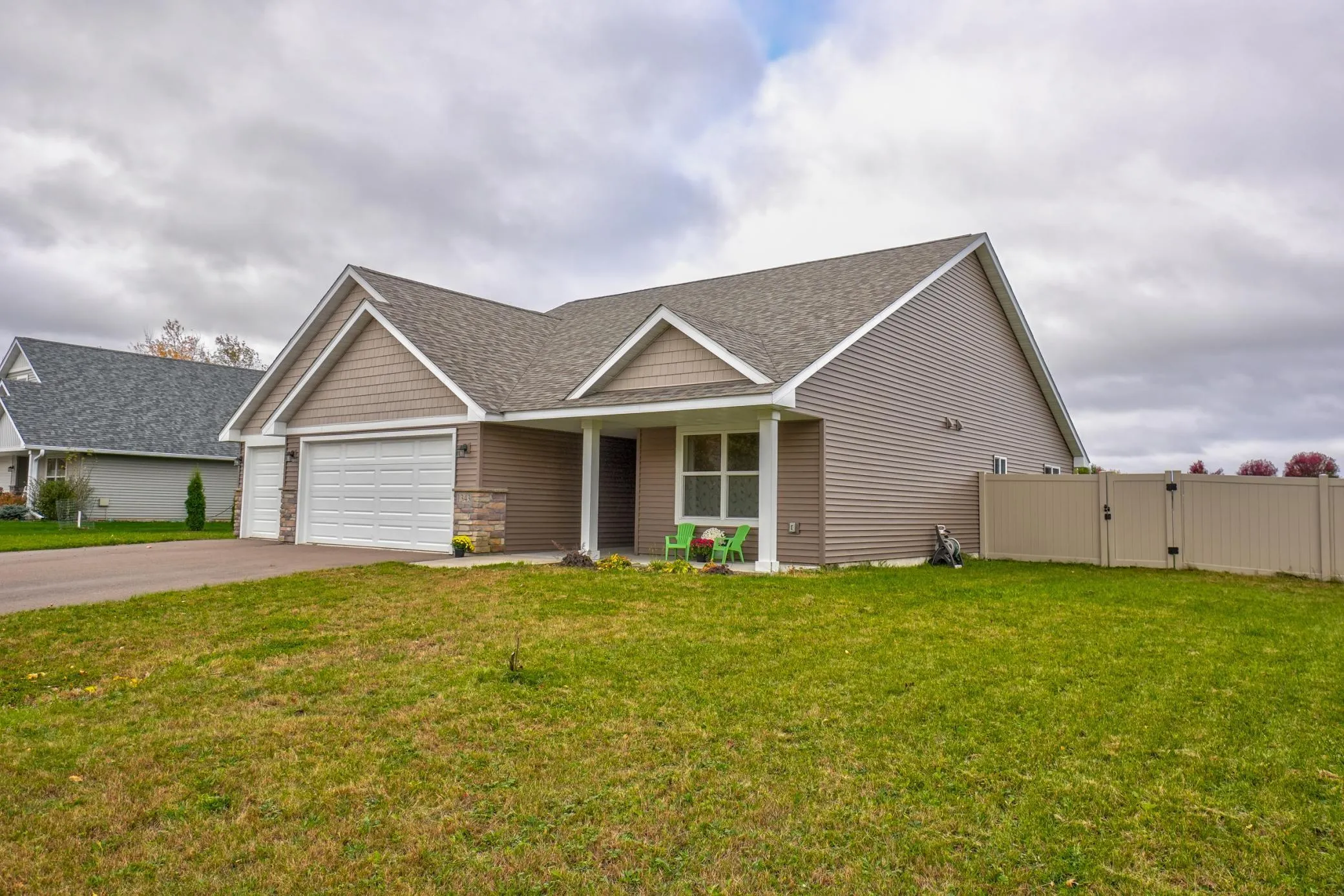 GREAT one level living only three years old! Private primary bath with double sinks and walk-in closet. Second bedroom and full 2nd bath as well. Laundry room with washer and dryer that stay. The entry foyer welcomes you in to the main living area with vaulted ceiling, kitchen window, kitchen island, patio door and lots of windows for sunlight! The front porch is also covered for your morning and evening enjoyment. BONUS – three car garage gives you room for multiple cars plus storage of toys, tools, bikes, or whatever you choose! The backyard is fenced in with a vinyl fence with two gates and includes a lifetime warranty that stays with the home. This home is lovely, and move-in ready too! Are you wanting to be settled before the holidays are upon us? Due to the seller’s relocation there is also a possibility for a quick close if you need it! (Virtual staging has been done in some of the photos.)