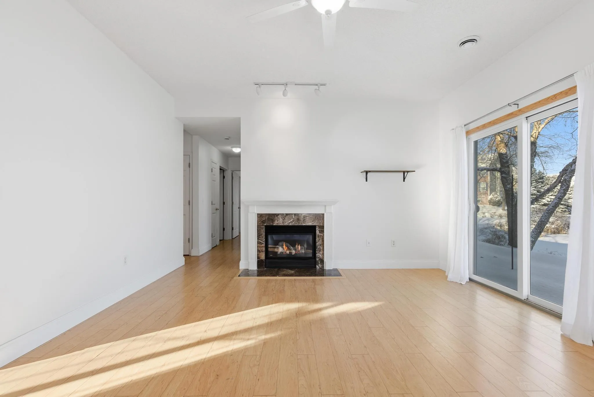 This stunning end-unit, one-level townhome offers 2 spacious bedrooms and 2 bathrooms in a peaceful, secluded setting overlooking a tranquil pond. The modern kitchen features stainless steel appliances, white cabinets, and a convenient breakfast bar, perfect for casual dining or entertaining guests. Enjoy cozy evenings in the living room with a gas fireplace, or step out onto the walkout patio to take in the serene views.