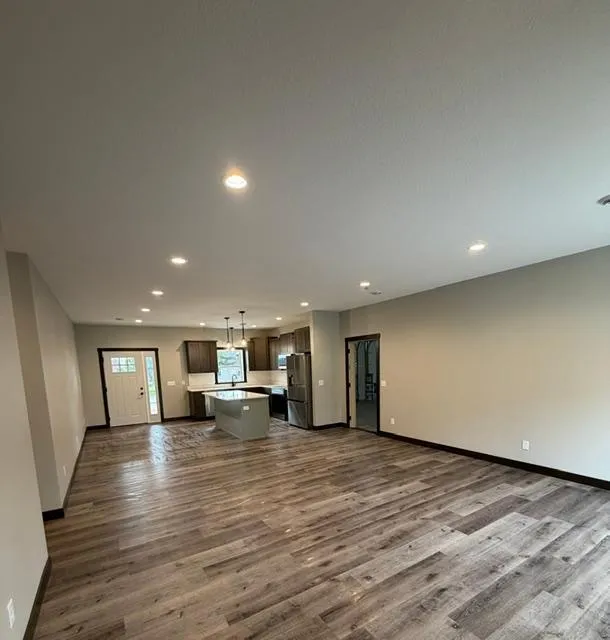 This quality-built slab-on-grade home offers 1,656 sq ft of single-level living with 3 bedrooms, 2 bathrooms, and an oversized 936 sq ft 2-car garage. The open-concept layout features 9 ft ceilings, luxury LVP flooring, solid wood doors, and custom trim throughout. The kitchen includes quartz countertops, an island, custom cabinetry, and stainless steel appliances. The private primary suite offers a walk-in closet and a spacious bath with double vanity and custom tile walk-in shower. Additional features include a large laundry/mud room, spray foam insulation with blown-in attic, forced air heating (in-floor heat plumbing ready—boiler optional), and energy-efficient construction. Exterior highlights include vinyl siding, cedar-wrapped posts, covered front porch, poured concrete back patio, paved driveway, and completed landscaping. Located on a quarter-acre lot in a quiet Clear Lake neighborhood, this home is ideal for anyone seeking modern comfort with low-maintenance living.