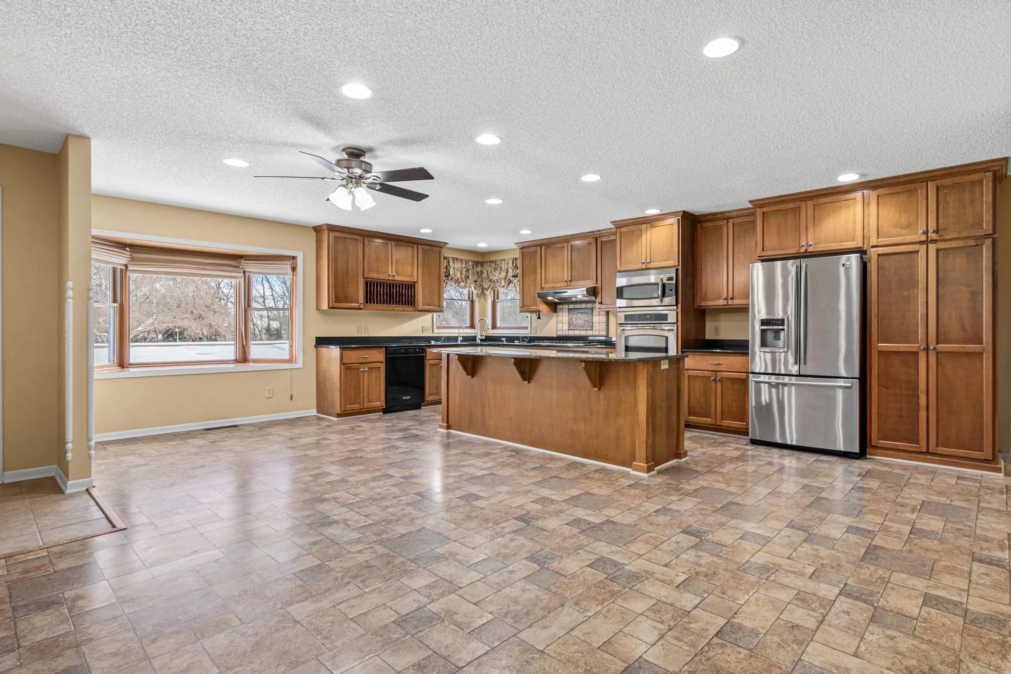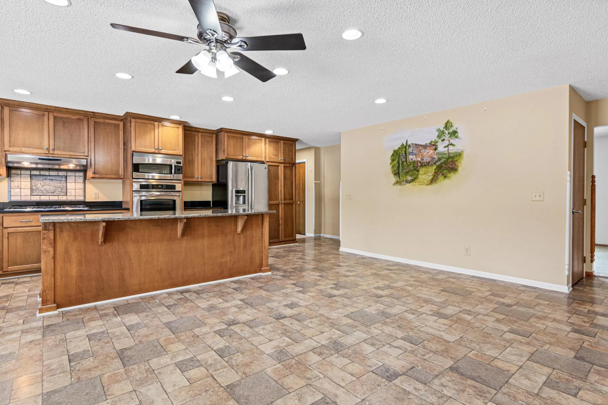 At the center of the home is a thoughtfully expanded custom kitchen designed for connection. A large center island anchors the space, creating an easy flow for everyday living and gatherings alike. The adjacent dining area offers ample room for a large TV, making it a natural hub for meals, conversations, and relaxing evenings. With laundry on the main level, single-level living is simple and practical, while the finished basement adds flexibility for entertaining, hobbies, fitness, or a quiet retreat.