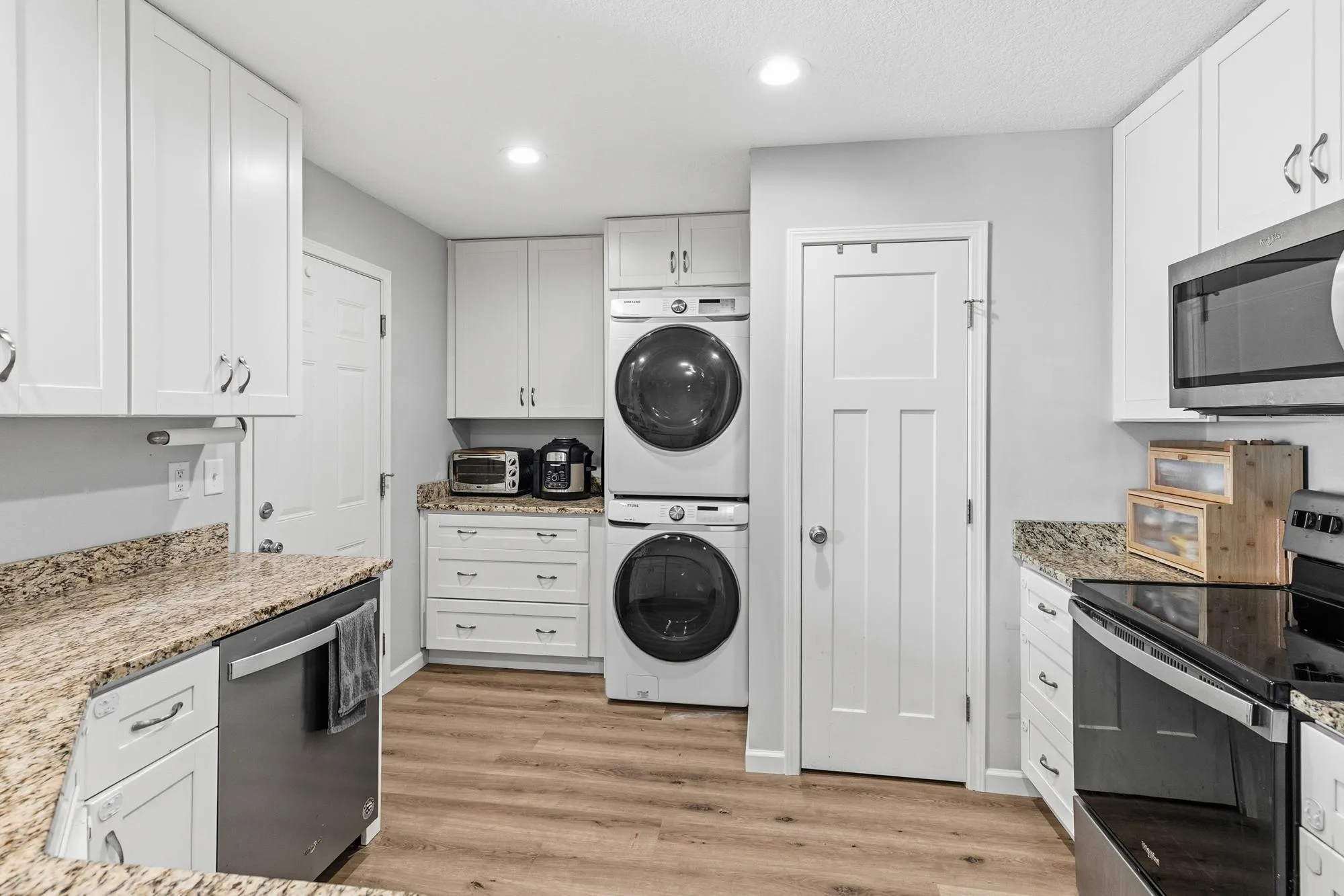 The stunning kitchen features custom white cabinetry, granite countertops, and sleek stainless steel appliances—perfect for cooking, hosting, and everyday living. The open-concept living area includes a gorgeous electric fireplace framed with built-in shelving, adding both style and warmth. Knockdown ceilings and recessed lighting run throughout the home, enhancing its clean, contemporary feel.