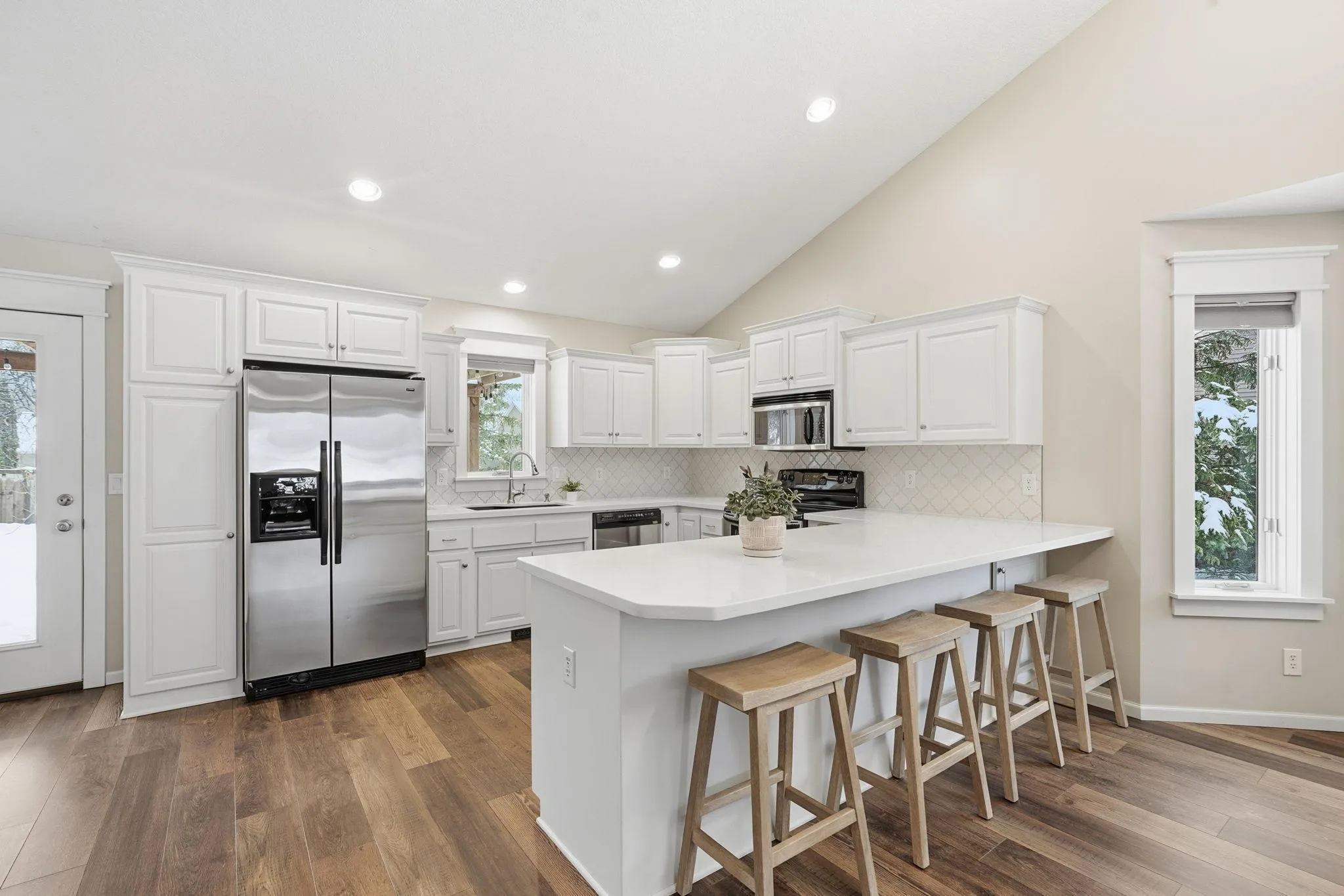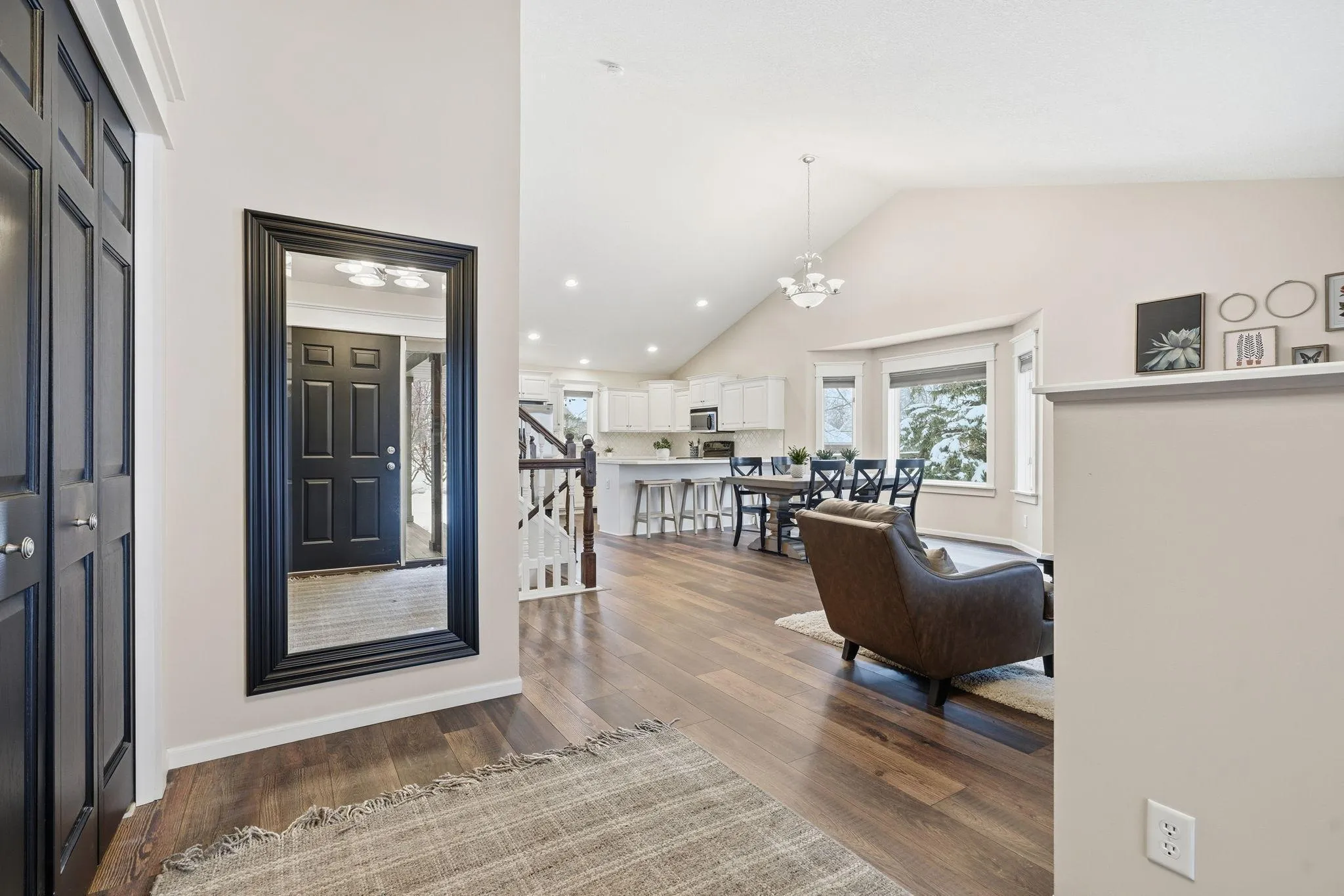 Meticulously maintained and beautifully updated, this home offers comfort, flexibility, and effortless flow. Vaulted ceilings and abundant natural light define the main living level, where the living room, informal dining area, and kitchen connect seamlessly. The kitchen opens to a private patio with pergola and bistro lighting—an ideal extension into the fully fenced, level backyard. The upper level includes two spacious bedrooms, a full bath, and a conveniently located laundry room. The elevated primary suite provides a retreat-like experience with heated bathroom floors, a jetted tub, dual vanities, custom built-ins, and two walk-in closets. The lower level offers a versatile family or playroom, ¾ bath, large mudroom with garage access, a dedicated theater room with surround sound, an additional bedroom or office, and ample storage. A clean, insulated three-car garage completes the property. Enjoy a welcoming front porch, mature landscaping, and proximity to top schools, sports facilities, highways, and city conveniences—balanced by a true small-town feel.