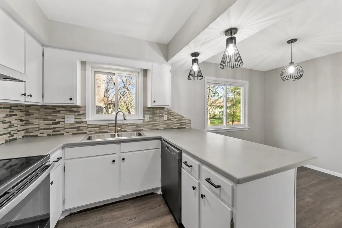 A fresh low maintenance retreat on the edge of town. Remodeled split-level end unit duplex ready to move in! 2024 Appliances, siding, shingles, furnace, AC, hot water heater, flooring and more! Step into the foyer onto new modern grey flooring. Upstairs is open concept with modern lighting, large living room and open kitchen with peninsula countertop, white cabinets and stainless steel appliances and a powder room. Lower-level houses two bedrooms, large bathroom and laundry. No association fees. Private yard surrounded by mature trees in the back yard.