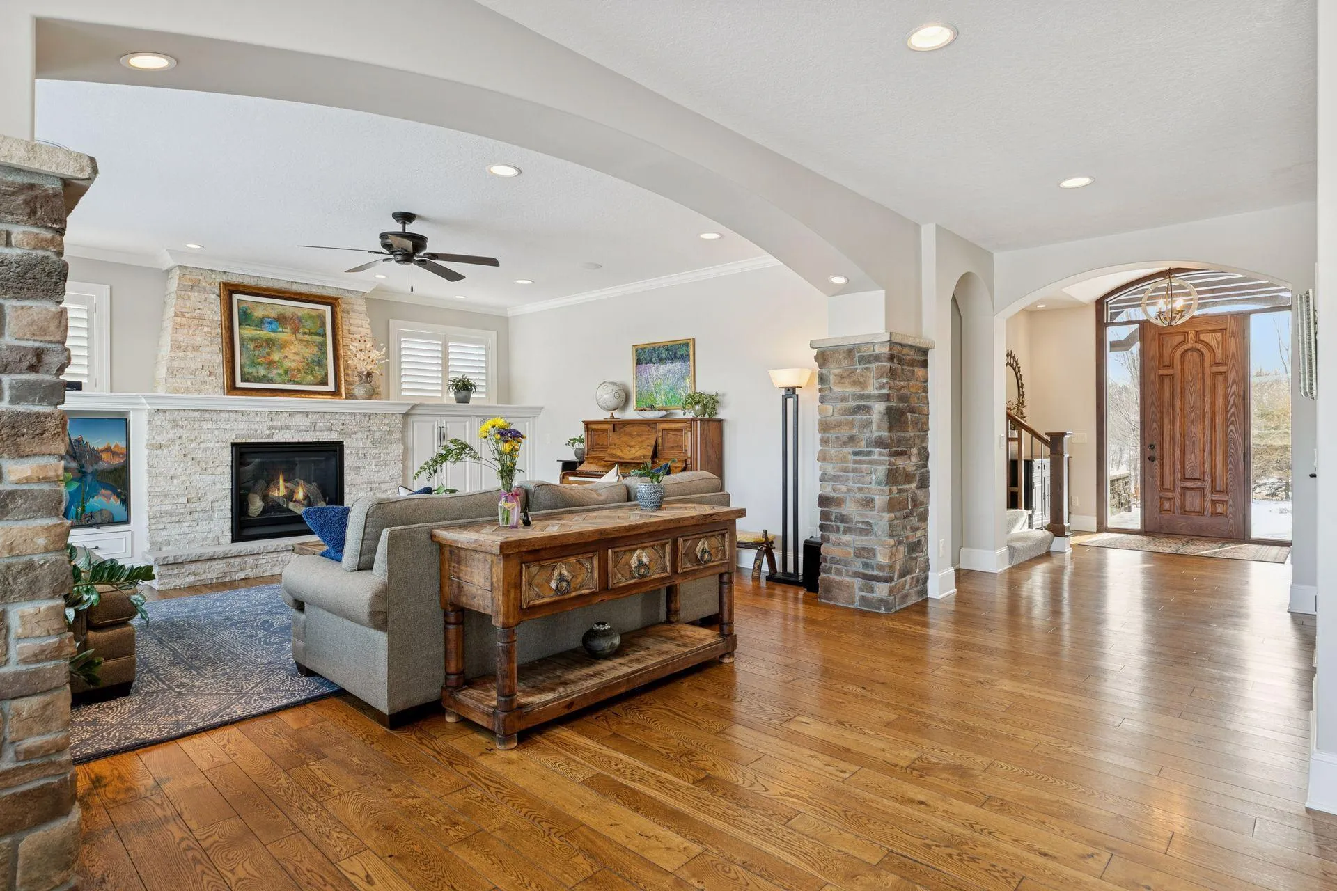 A striking front elevation welcomes you with a beautiful porch and stamped concrete walkway, setting the tone as you enter the home. Rich wood floors span the main level, complemented by newly painted enamel trim and an open, flowing floor plan ideal for both everyday living and entertaining. The gourmet kitchen is a showstopper, featuring Wolf and Sub-Zero appliances (2024), a walk-in pantry, and new quartz countertops (2025). Three fireplaces throughout the home add warmth and ambiance, while the vaulted screen porch off the kitchen is perfect for enjoying warm summer evenings.