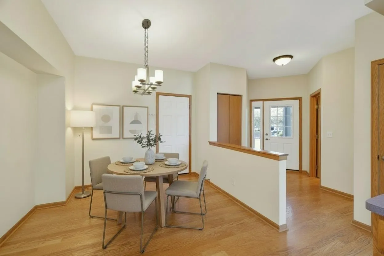 This sun-filled, three-level end-unit townhome is tucked at the back of the community, offering privacy and peaceful surroundings. West-facing windows fill the home with warm afternoon light, while vaulted ceilings on the main and upper levels create an open, single-family feel. The main level features a circular flow ideal for entertaining, with a generous kitchen and dining area that opens to a private, low-maintenance deck overlooking a quiet dead-end road. The lower level provides a spacious family room perfect for game nights, complete with a dry bar and rough-in plumbing for future customization. Upstairs, a versatile loft offers the perfect flex space for a home office, reading nook, or guest area. The primary suite impresses with vaulted ceilings, a walk-in closet, and a private full bath. Enjoy the convenience of an upper-level laundry room with added space for drying and storage. The current owners have updated the furnace, A/C, water heater, dishwasher, and refrigerator—ensuring peace of mind. A two-car attached garage and nearby guest parking add extra convenience. Prime Eagan location close to freeway access, Cedar Grove Transit Station, Twin Cities Premium Outlets, and the airport.