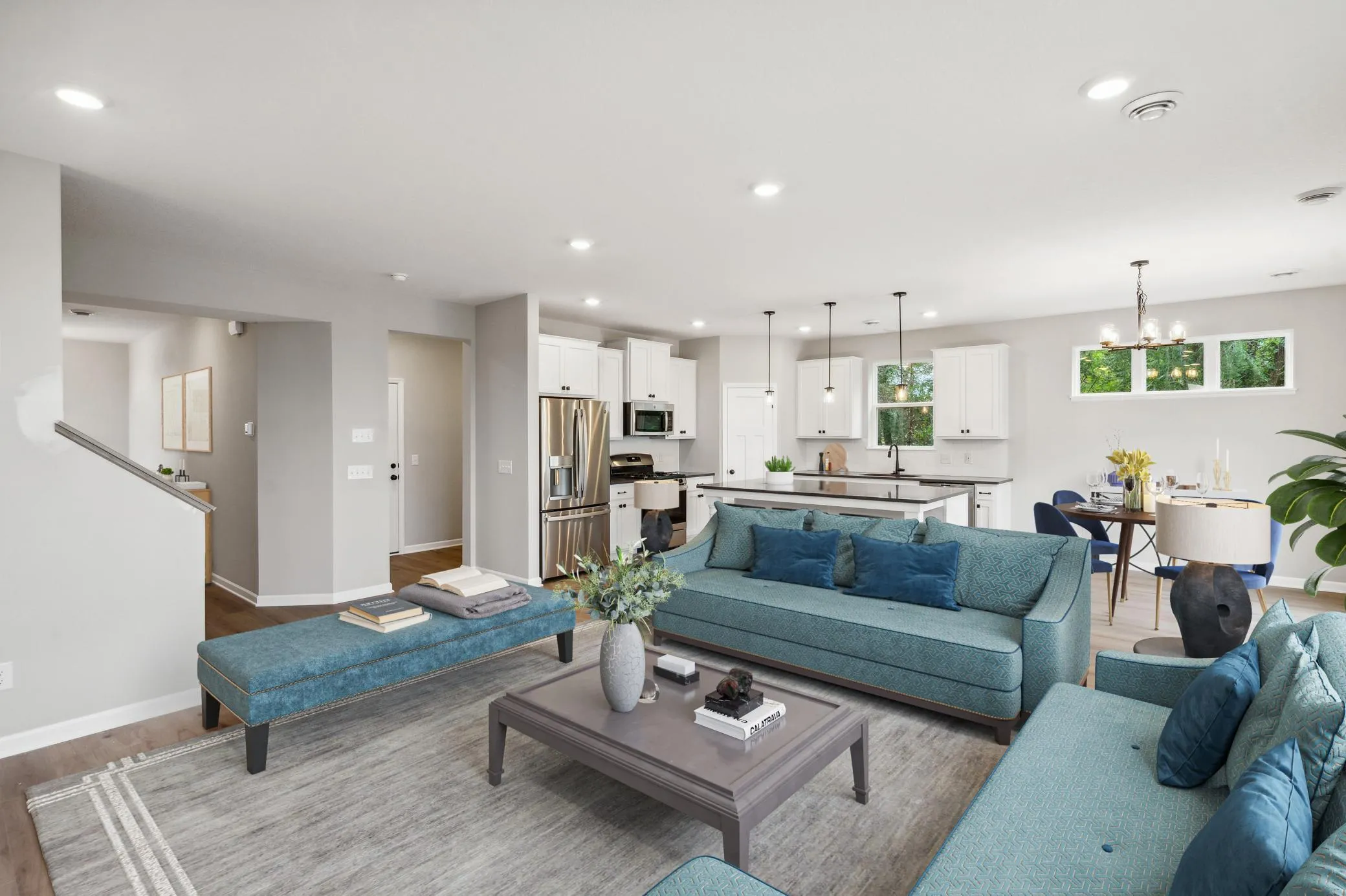 The open-concept design seamlessly connects the family room, kitchen, and dining area to create an ideal environment for both daily life and entertaining. You’ll love the large kitchen, which includes new appliances, an angled island, quartz countertops, and a corner pantry. A mud room and half bath complete the first floor.