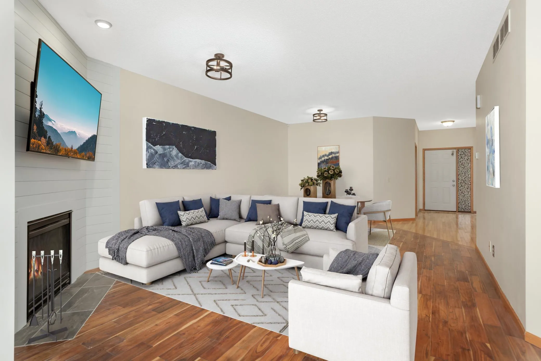 kitchen. The bright living room features a cozy gas fireplace for year-round comfort. The finished lower