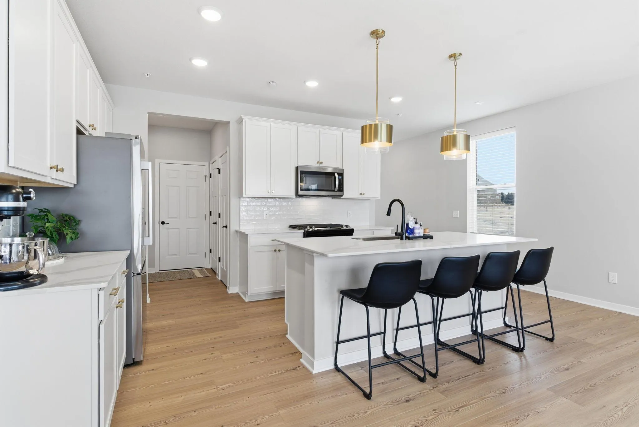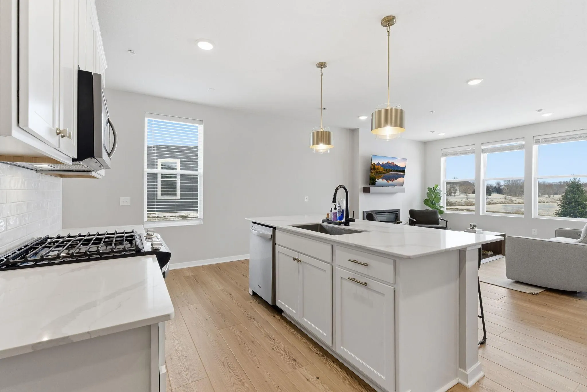 The main level features a bright, open-concept layout with upgraded finishes, stylish window treatments, and durable luxury flooring. The spacious kitchen is the heart of the home, complete with a large center island, upgraded cabinetry, modern lighting, and stainless steel appliances—perfect for entertaining or everyday living. The adjoining living and dining areas are filled with natural light, enhanced by the premium end-unit location.
