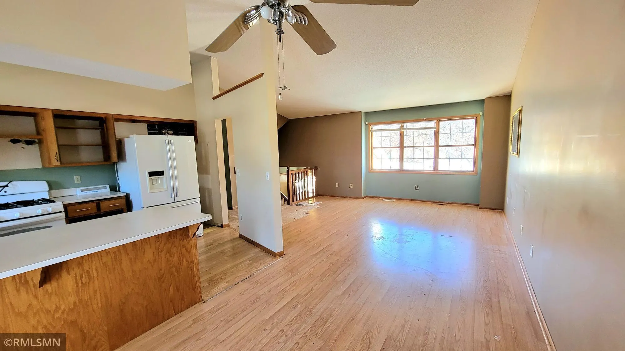 Split-entry home with solid bones waiting for its next chapter. Main level features two bedrooms, full bath, and a living/dining combo with vaulted ceiling and patio door stepping out to an oversized deck. Lower level adds a third bedroom, 3/4 bath, laundry room, and large rec room with gas fireplace (condition unknown).