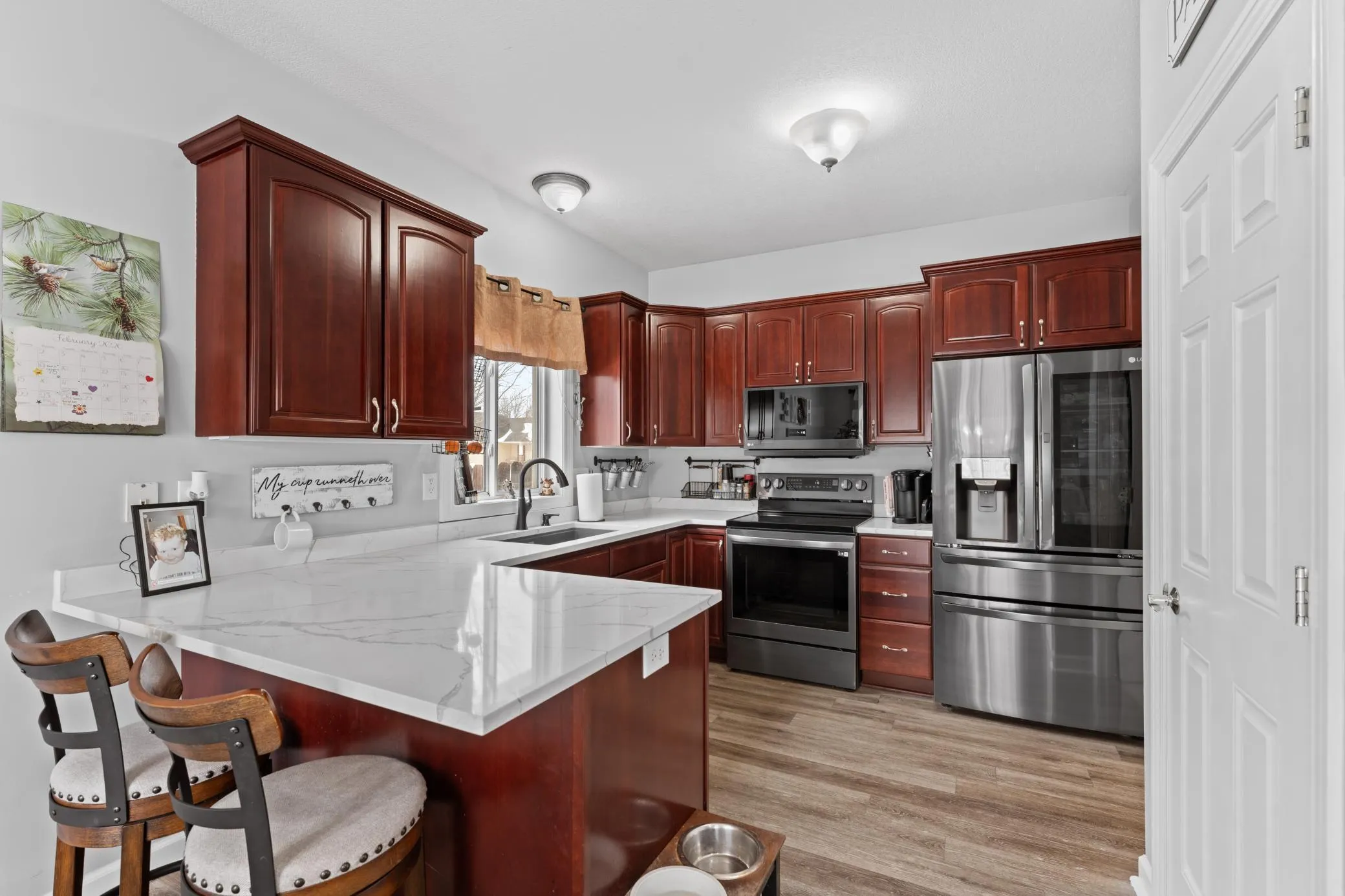 This meticulously maintained ranch-style home is packed with updates. Features include newer stainless-steel appliances, quartz countertops, cherry cabinetry, LVP flooring throughout, paneled doors, finished garage and main-floor laundry. Outdoor amenities include a 16×20 composite deck, 20×25 basketball court, and garden boxes, along with a new garage door and front entry door. Don’t wait! This one will go FAST!