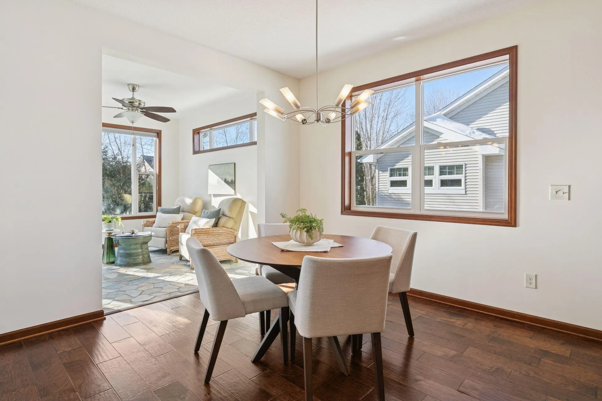 The kitchen is well-equipped with abundant cabinetry and smart storage solutions, including pull-out drawers, a lazy Susan, and a built-in steamer in the countertop. Updated appliances in 2025 include a washer, dryer, and electric range, while the existing gas line remains in place for those who prefer a gas stove. The sunroom is a standout feature, offering heated stone floors that allow for comfortable enjoyment year-round and provide a warm, inviting space to relax or entertain.