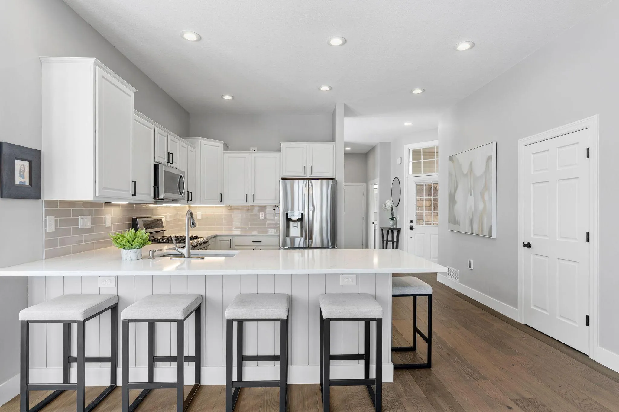 backdrop. The main floor flows perfectly. The kitchen combines enameled cabinetry hiding smart roll-out storage, under-cabinet lighting, quartz