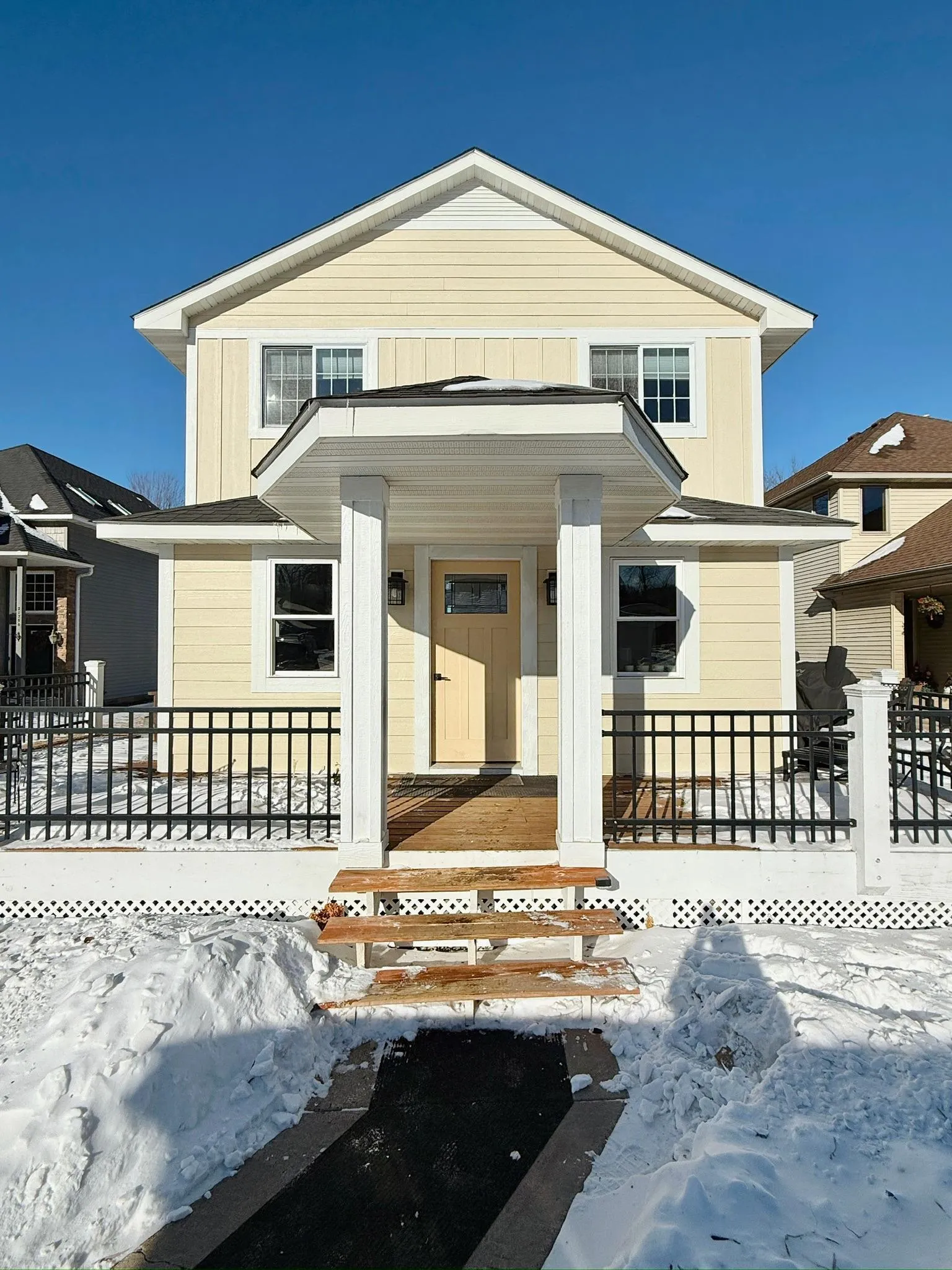 Modern Craftsman design meets relaxed lake-cottage living in this thoughtfully designed 4-bedroom, 2-bath lakefront home on highly sought-after Ideal Avenue, the name truly lives up to it. Set on a .3-acre lot with 50 feet of lakeshore, this Forest Lake property offers a well-balanced setting that combines lakefront living with a vibrant, established neighborhood feel. Inside, high ceilings and hardwood floors create a warm, inviting atmosphere that feels both elevated and comfortable. The kitchen features a functional layout with an island and flows naturally into the surrounding living and dining spaces, anchored by a cozy fireplace—perfect for every Minnesota season. Large windows throughout the home invite in natural light and frame peaceful lake views. Outside, the lifestyle takes center stage. An expansive deck overlooks the water and is ideal for sunset dinners, morning coffee, or gathering with friends and family. The shoreline offers shallow, swimmable water, making it easy to enjoy the lake throughout the day. A welcoming front porch, detached two-stall garage, and recent exterior updates including new LP SmartSide siding and windows provide everyday ease and low-maintenance living. Located just off Highway 97, this home offers convenient access to town, schools, and everyday essentials while remaining part of an ideal neighborhood made up primarily of full-time residents. The neighborhood offers a one-mile walking route that adds to the lifestyle appeal, making it easy to enjoy the area on foot year-round. A rare opportunity to own a Forest Lake home with 50 feet of lakeshore that has been loved and cared for by the same family for 30 years.