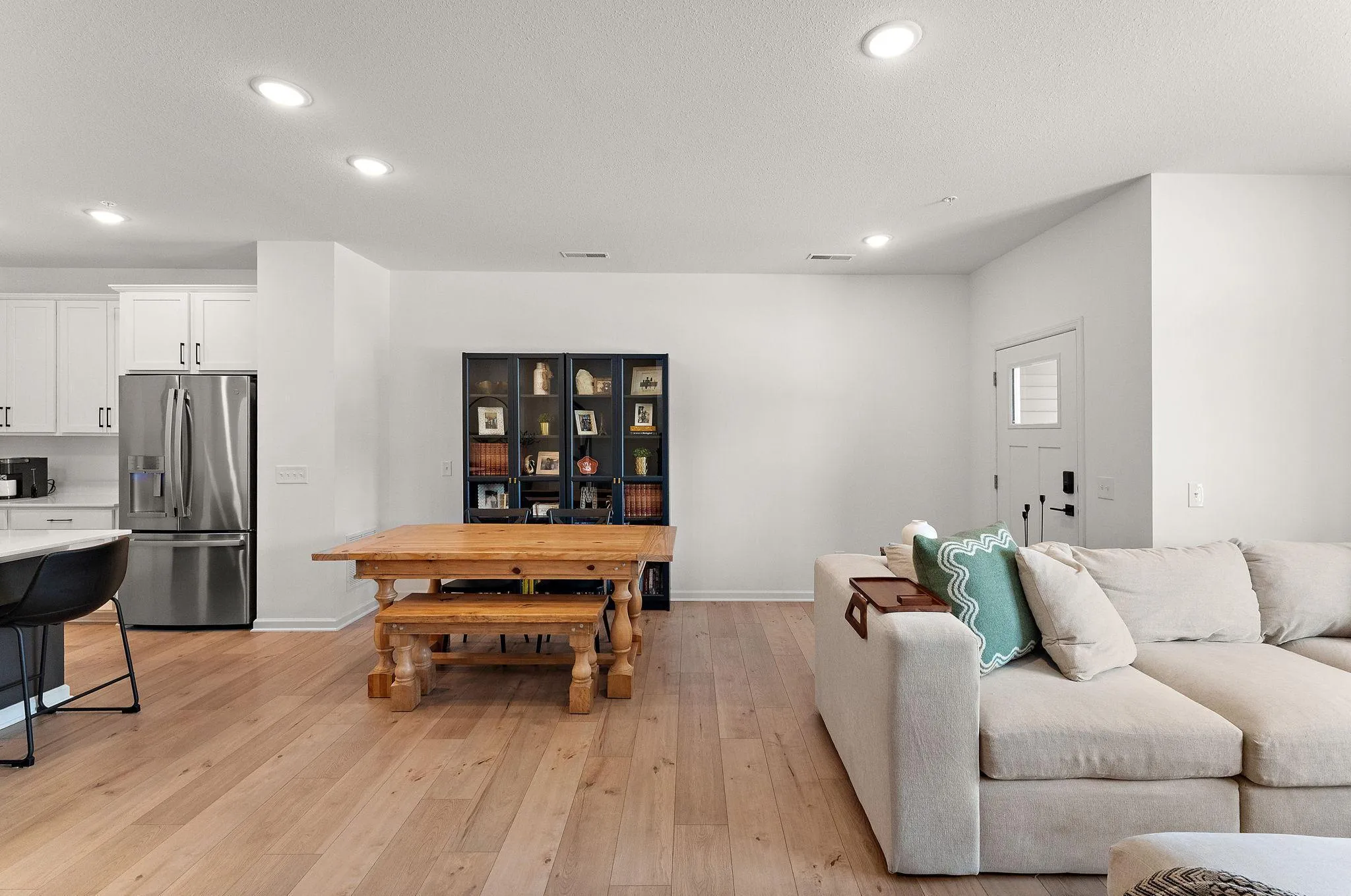 This David Weekley Homes–built townhome in the Reserve at Twin Lakes offers breathtaking lake and forest views from both the Primary Suite and the main level. In the summer, step out your front door, sip coffee in your Adirondack chair, and watch nature pass by—or head out onto the walkways. These same stunning views are enjoyed indoors from the open-concept main floor, featuring a beautifully decorated kitchen with stainless steel appliances, quartz countertops and island, a walk-in pantry, ample dining space, and a bright family room highlighted by a wall of windows. Exceptionally maintained, this 3-bedroom, 3-bath home is truly *like new* and thoughtfully customized. All door hardware—including knobs, handles, and pulls—has been upgraded to matte black. Accent walls enhance the living spaces, and ceiling fans have been added throughout. The laundry room includes custom solid wood shelving, and the loft area is ideal for a home gym or a second work-from-home office. The Primary Suite features a private bath and walk-in closet, all overlooking the lake and wooded surroundings. The garage is outfitted with 20 feet of heavy-gauge, steel-constructed, stud-mounted shelving designed to fit standard storage bins, installed at a 24-inch depth and 6 feet above the floor—perfect for truck bed and SUV clearance. A TV wall mount (included) can accommodate a 55″ TV for home tailgating. Ample guest parking is available. The community offers a dog park/run, a firepit gathering area, and scenic trails and walkways around Twin Lakes. Conveniently located with all local amenities just minutes away.