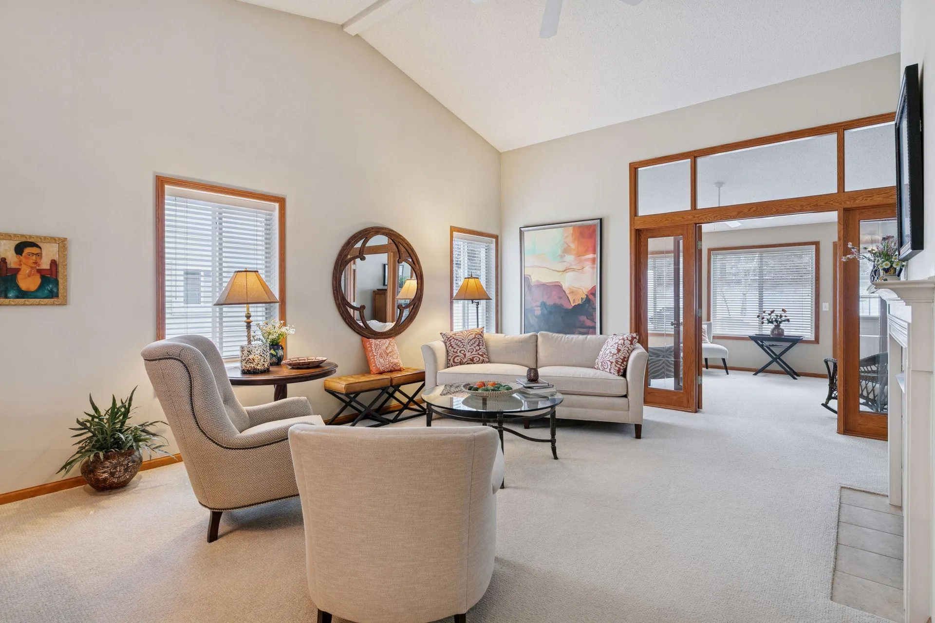 Beautiful end-unit rambler townhome in the highly desirable Eagle Creek Bluff neighborhood. Meticulously maintained and thoughtfully designed for effortless one-level living, this home offers an open, light-filled layout that feels inviting from the moment you enter. The kitchen features an eat-in area and tasteful updates including new appliances and new flooring. The informal dining area sits perfectly between the kitchen and cozy living space, where vaulted ceilings and a gas fireplace create an ideal setting for entertaining. The sunroom is a true retreat, filled with natural light and opening to a private, tree-lined patio for seamless indoor-outdoor living. The spacious primary bedroom includes a walk-in closet and private bath, with a second bedroom ideal for guests or a home office. Recent updates include a new roof (2025), water softener, toilets, kitchen flooring, appliances, and smoke detectors. Ideally located near parks, trails, shopping, and schools