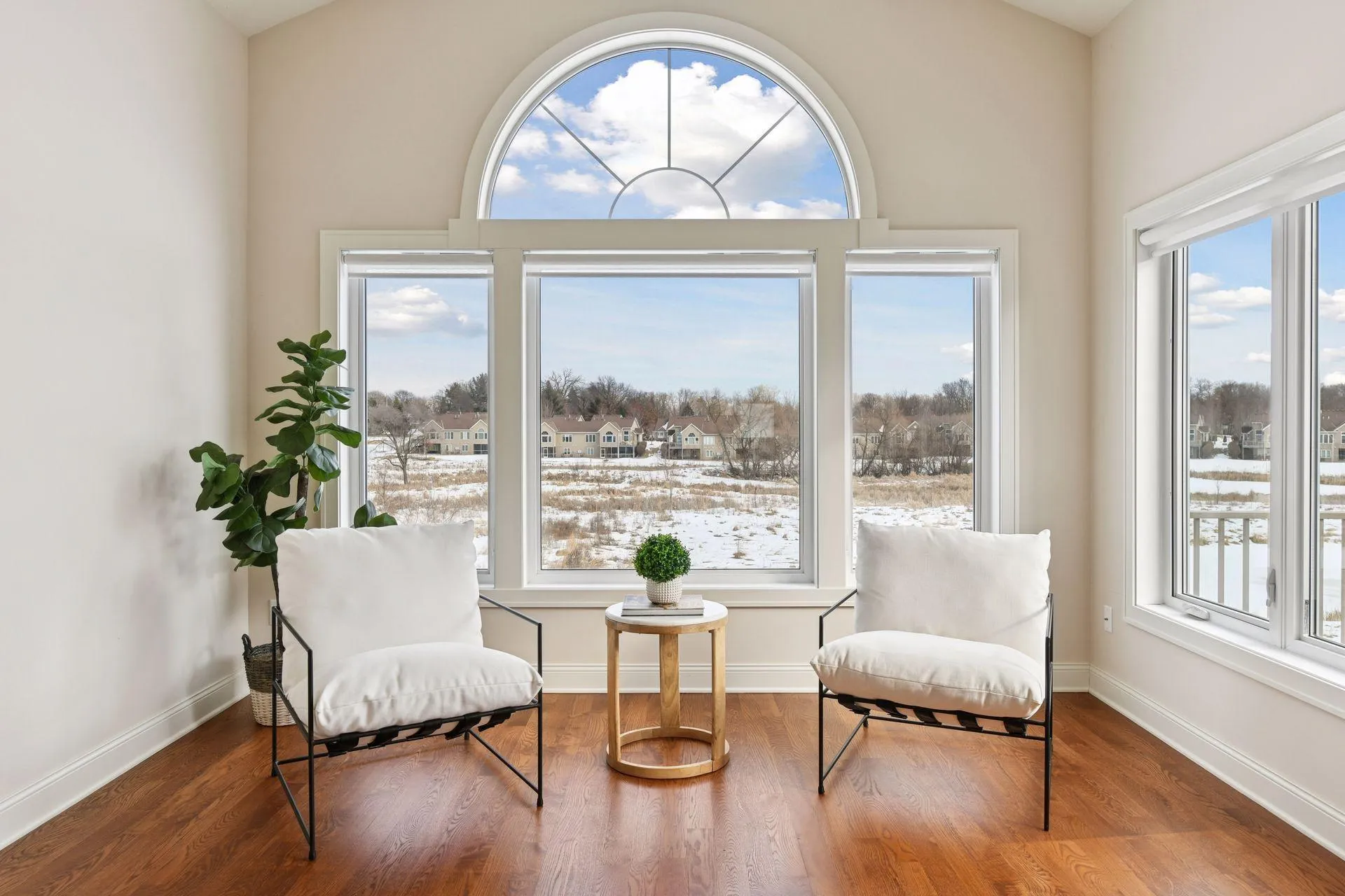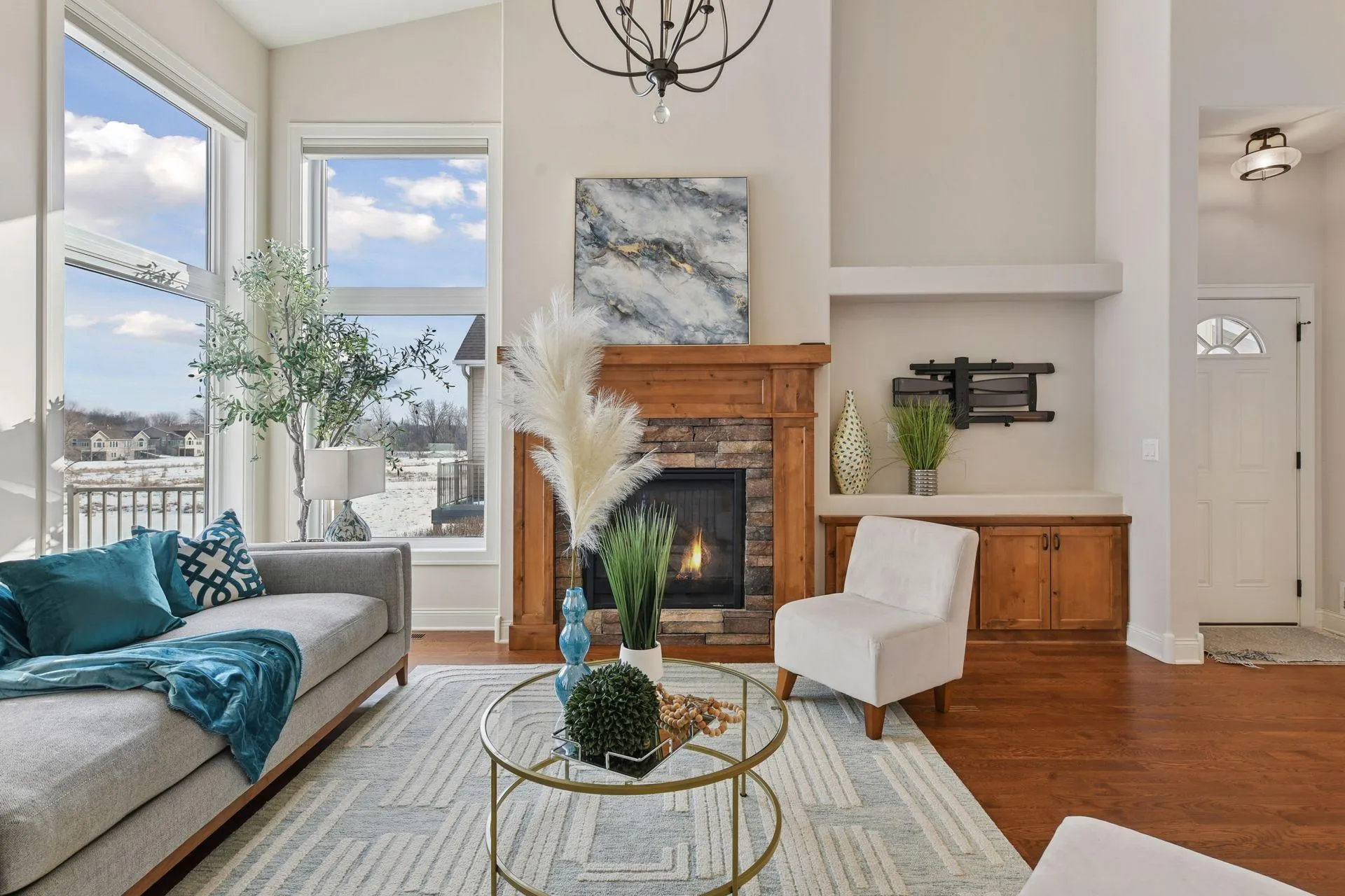 Absolutely stunning custom-built home showcasing quality craftsmanship and thoughtful design throughout. Upon entry, you are welcomed by soaring 15-foot vaulted ceilings and dramatic floor-to-ceiling windows that flood the home with natural light. Hardwood floors, curved architectural walls, and an open layout create a warm and inviting main living space, anchored by a gas fireplace.
