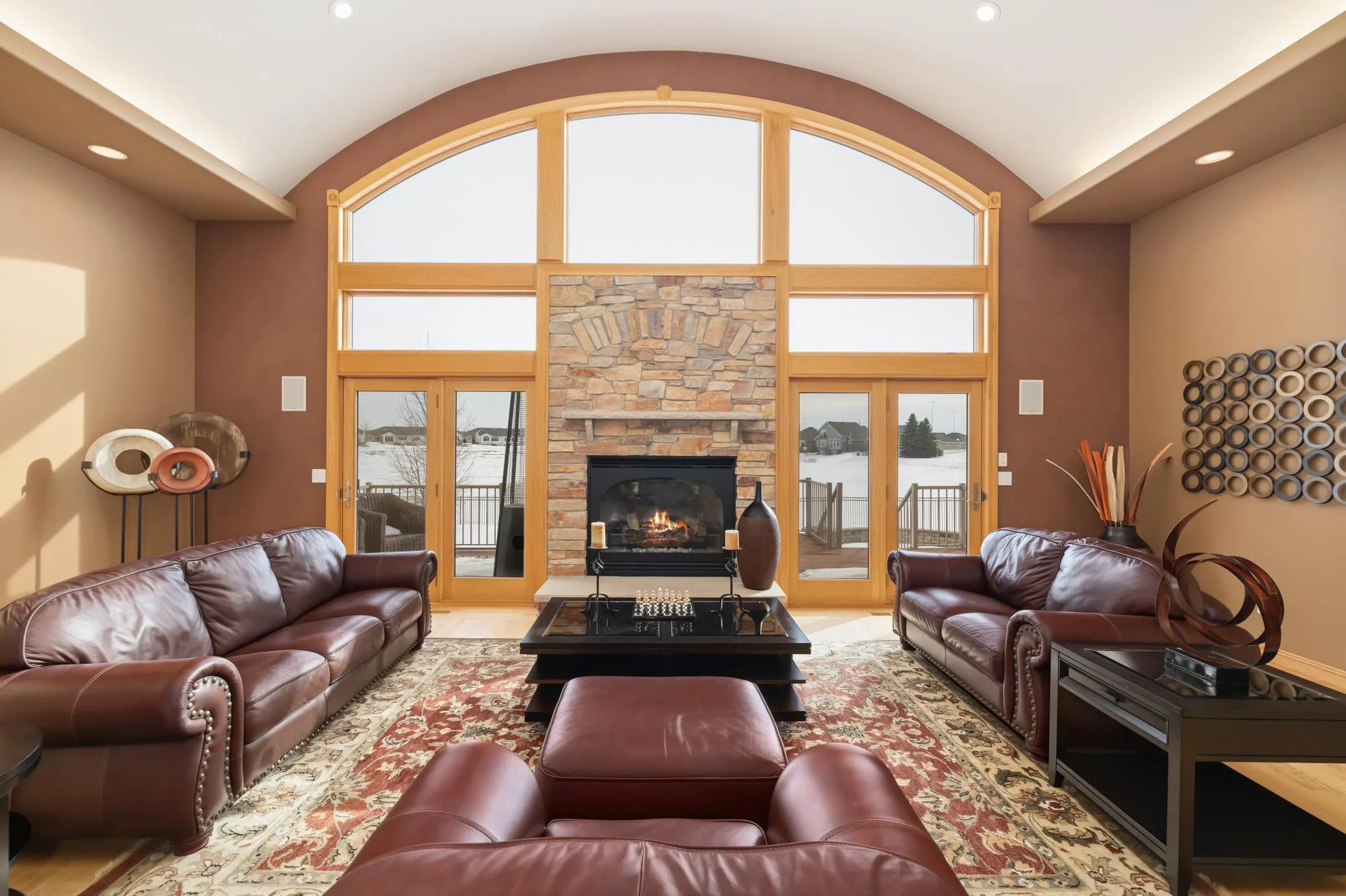 Hardwood floors flow seamlessly across the main level, leading you into an open, refined living space highlighted by a rare barrel ceiling—an architectural focal point that adds warmth and sophistication. The chef’s kitchen is outfitted with professional-grade appliances, offering both beauty and performance for gatherings large and small.