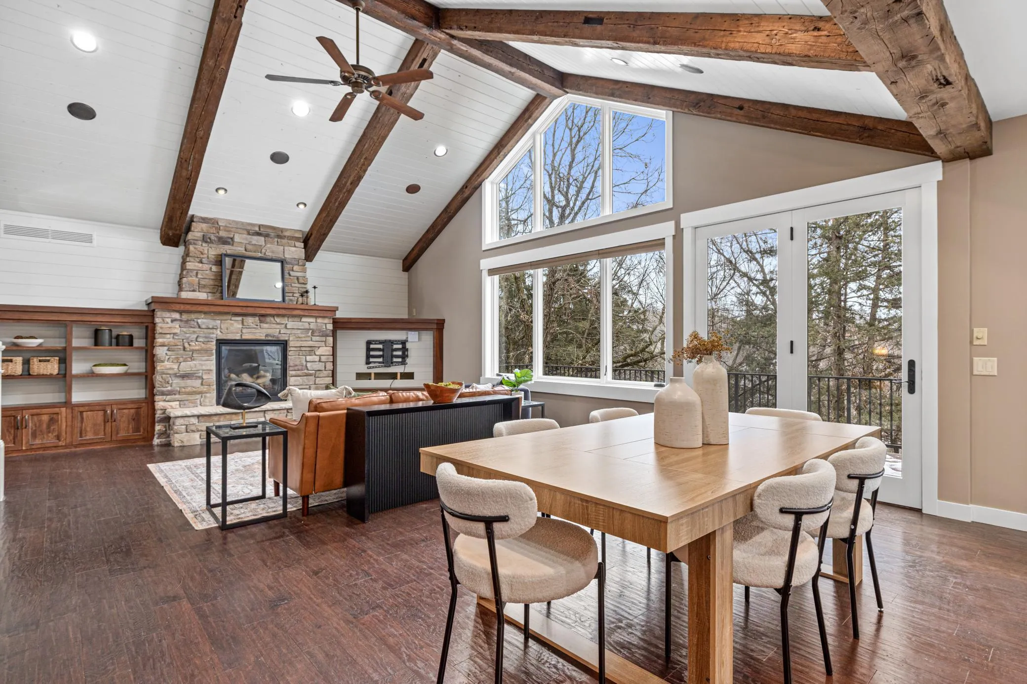 Inside, natural light pours through expansive windows, illuminating the open-concept great room where dramatic exposed wood beams and a white tongue-and-groove ceiling frame the soaring vaulted space. A floor-to-ceiling stone fireplace with substantial wood mantel creates a stunning focal point, flanked by custom built-ins that blend beauty and functionality. Rich hardwood floors and fresh paint carry warmth throughout.