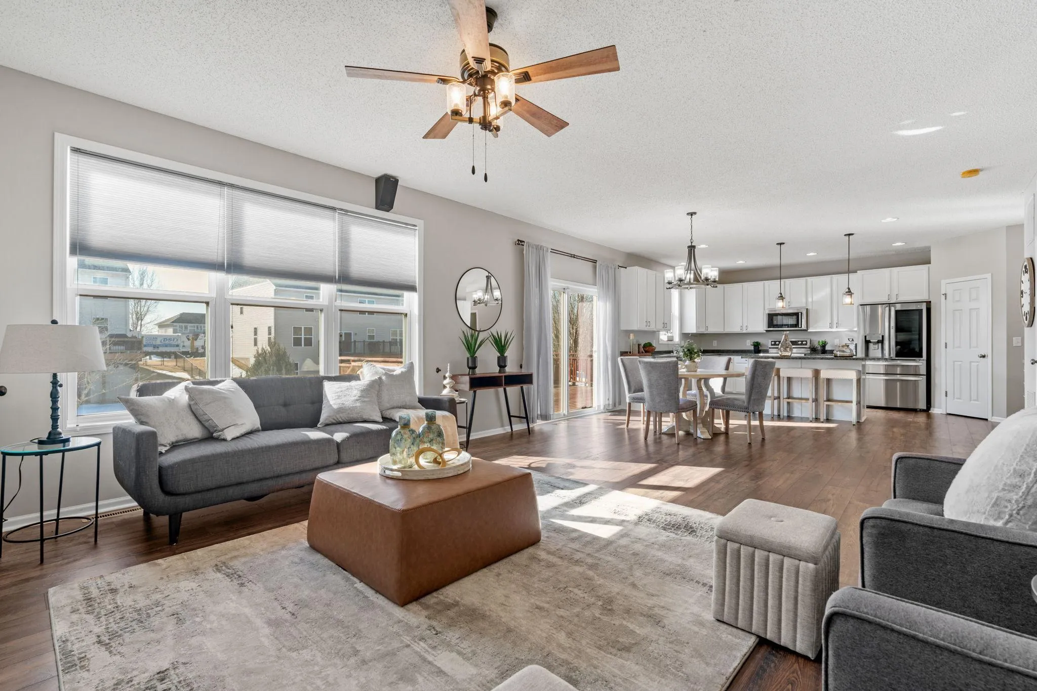 The main level features an open-concept layout filled with natural light, seamlessly connecting the living room, dining area, and kitchen. The kitchen is equipped with stainless steel appliances, abundant cabinetry, a center island with seating, and easy access to the oversized deck, perfect for the upcoming warmer season. Upstairs, you’ll find generously sized bedrooms, a convenient laundry room, and a spacious primary suite with a large walk-in closet and private bath. The unfinished lower level provides excellent potential to build equity and customize additional living space to suit your needs. The three-car garage includes a dedicated outlet suitable for EV vehicle charging. Enjoy outdoor living with a large deck overlooking the fenced backyard and a patio area below. Located near parks, trails, schools, and local amenities.