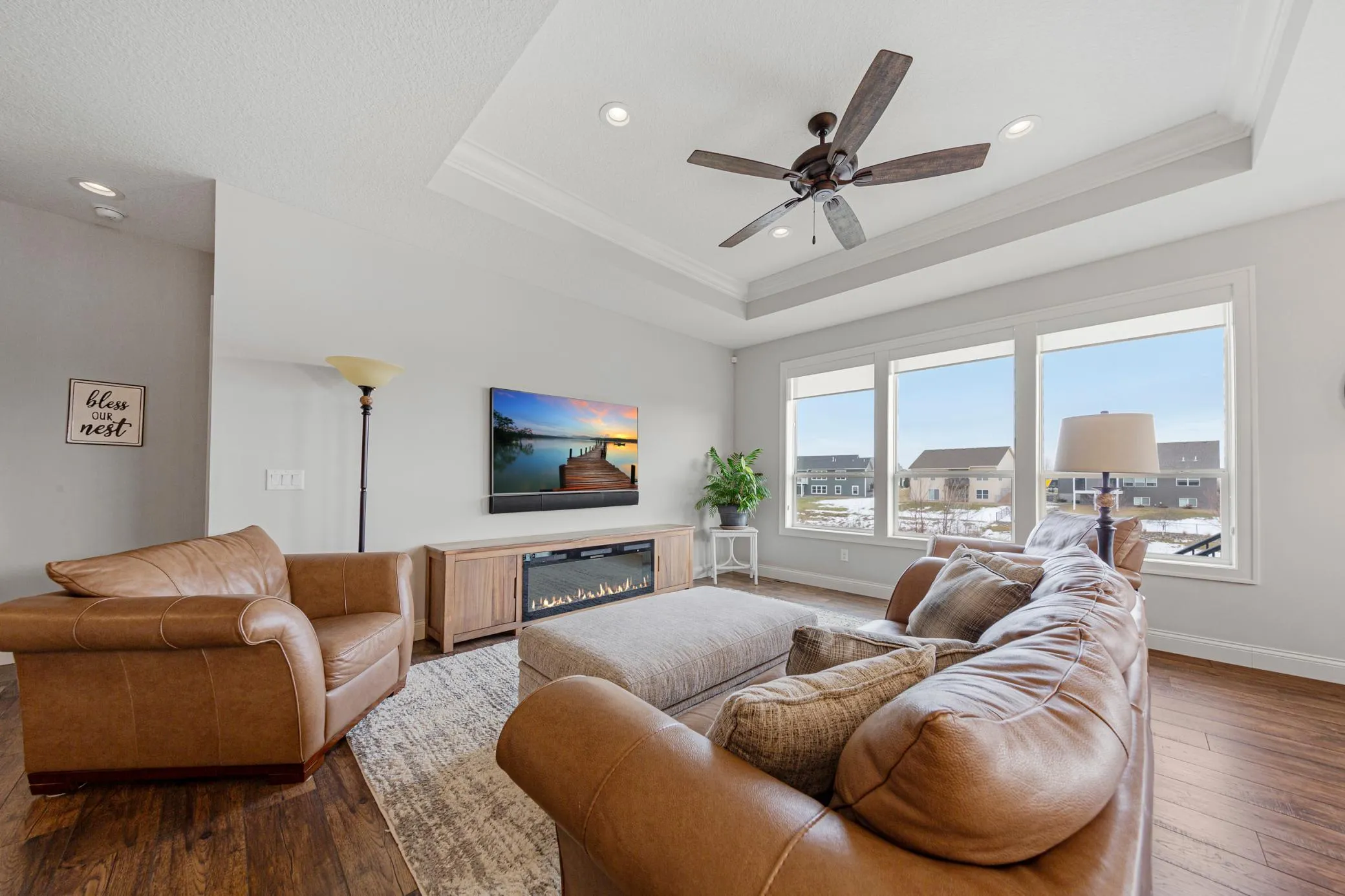 Large windows fill the home with natural light and showcase peaceful pond views from the beautifully landscaped backyard.