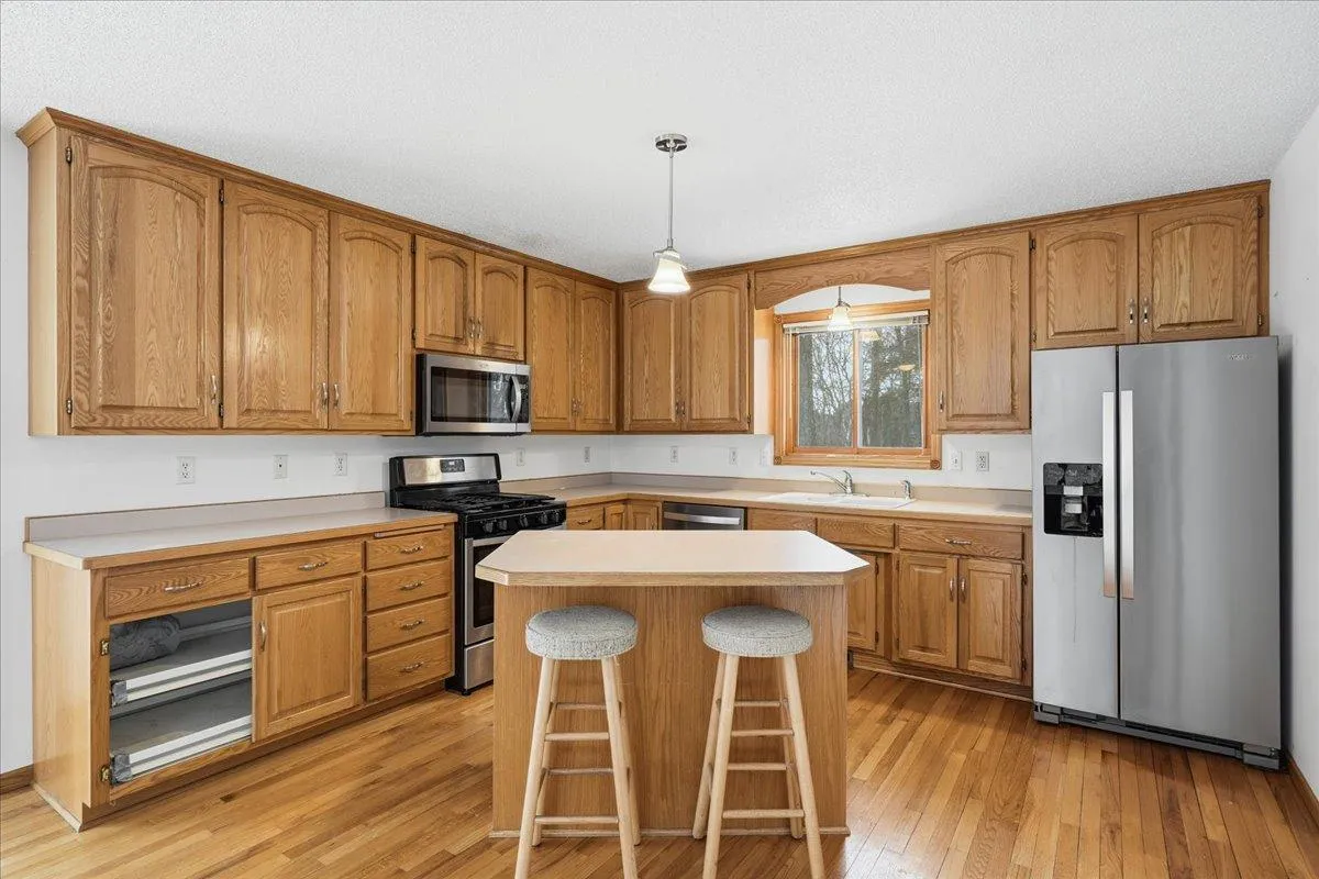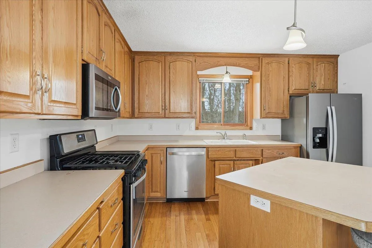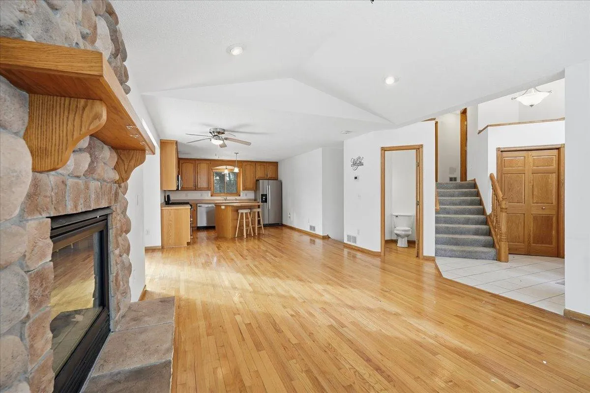 Welcome to this beautifully maintained home set on 2 wooded acres, offering privacy, space, and inviting curb appeal. Surrounded by mature trees, the property provides a peaceful setting while still offering the comfort and functionality today’s buyers are looking for. Inside, hardwood floors and a vaulted ceiling create a warm, open feel in the main living areas. Two stone gas fireplaces add charm and comfort, perfect for relaxing evenings or gathering with guests. The kitchen is thoughtfully designed with a center island, gas range, and stainless steel appliances, providing both style and practicality for everyday living and entertaining.