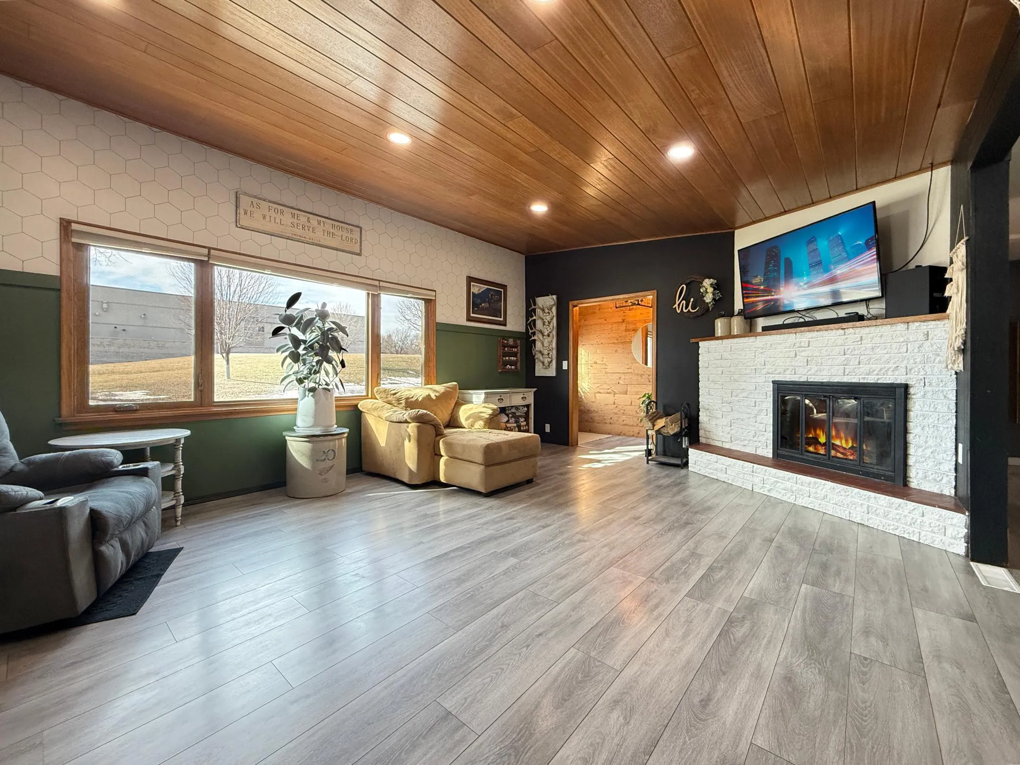 Step into the large living room, where a huge picture window fills the space with natural daylight and a cozy wood-burning fireplace creates the perfect gathering spot. A convenient doorway leads to the dining area and kitchen, providing an easy flow for everyday living and entertaining.