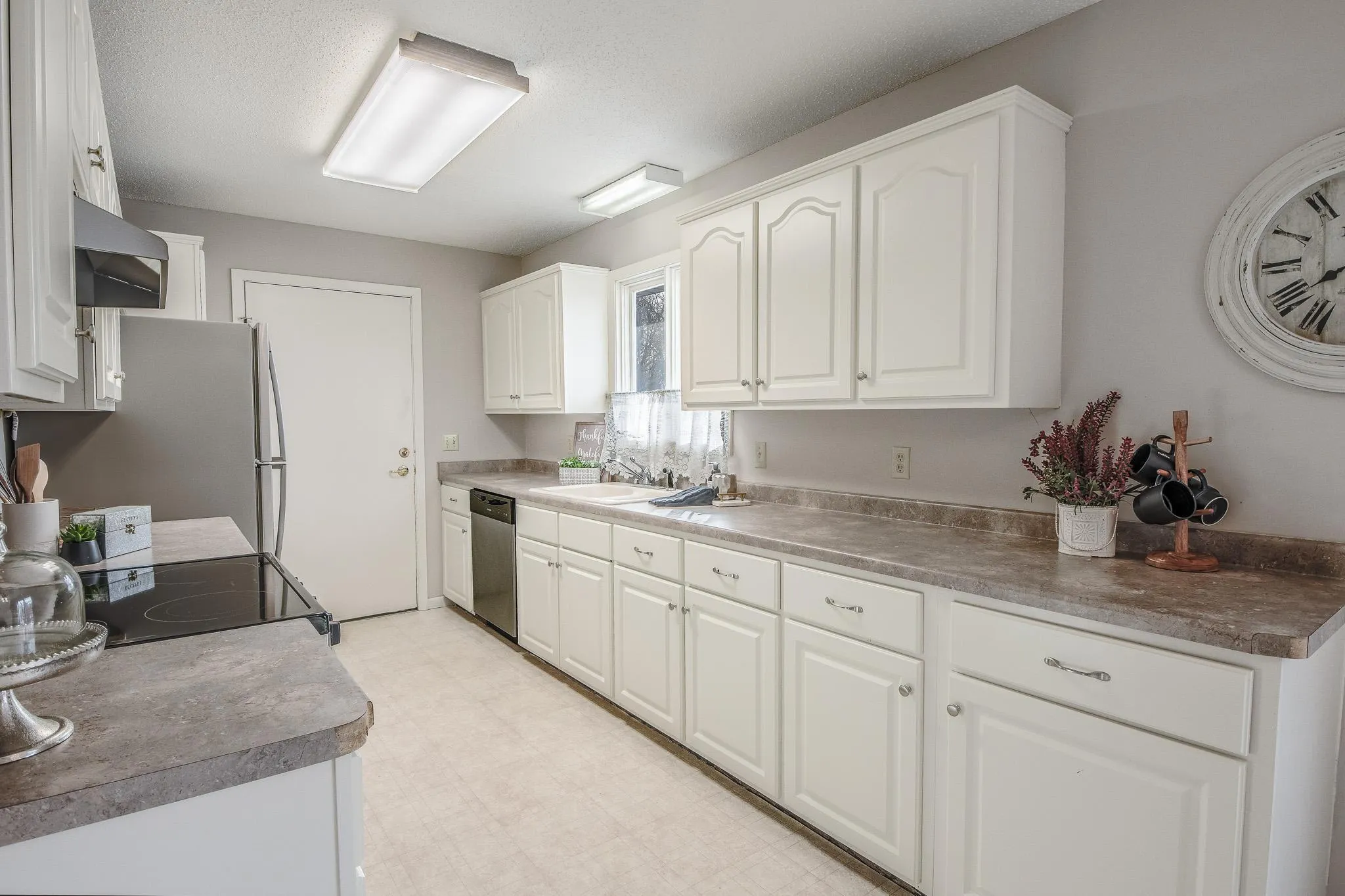 Step inside this zero-entry home to an inviting room featuring a cozy fireplace. The dining area overlooks the backyard and includes a patio door leading to the upper-level deck, complete with stairs down to the walk-out lower level. The kitchen has been updated with white cabinetry, providing a bright and functional space.
