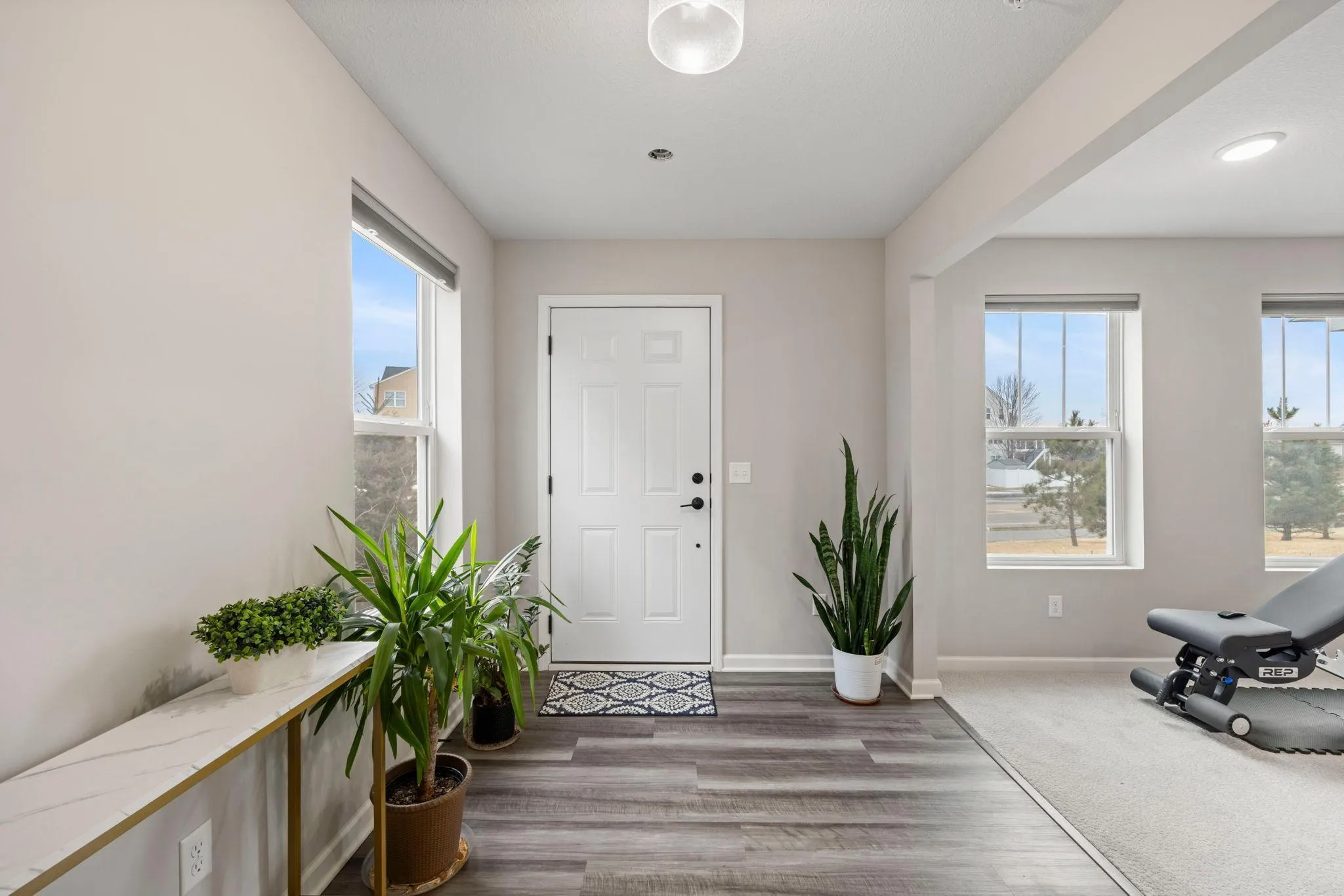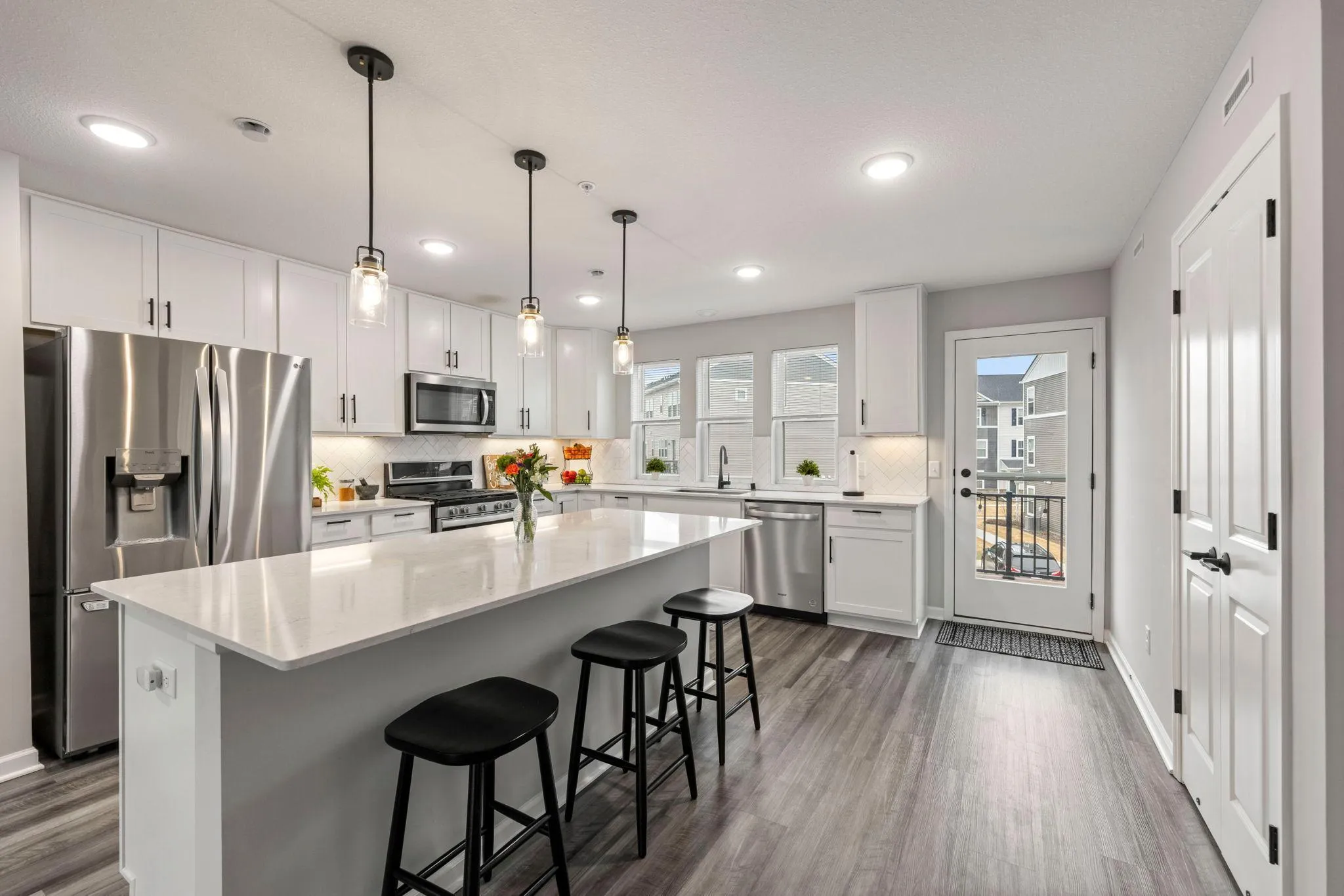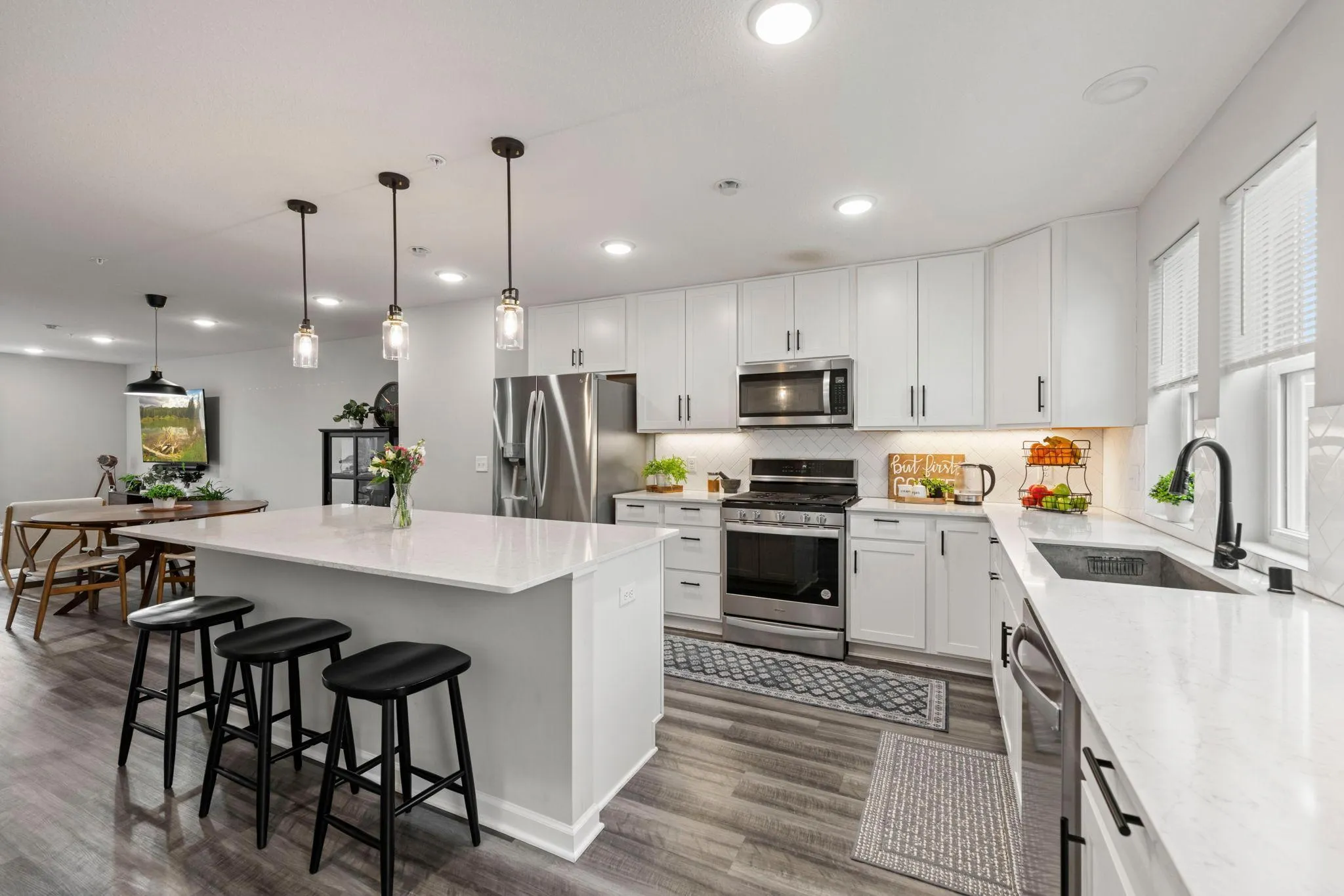 Bright and Sunny End Unit Townhome Located in Desirable Apple Valley Neighborhood. Enjoy Private Park and Easy Walking Distance to New Shops, Restaurants and Trails. Impeccable Interior Condition makes this property Like New Construction without the wait! Entry Foyer with Side Facing Window, Luxury Plank Flooring and Built-in Boot Bench provides the initial welcome. Versatile Family Room with Triple Windows is perfect for Playroom, Theatre Space or Home Gym. Convenient 1/2 bath and Garage entry. Main Level Features Spacious Living Room with LVP Flooring, Triple Windows, High Ceilings and Neutral Decor. Adjacent Dining Space includes LVP Flooring, Overhead Lighting plus 2 Spacious Storage Closets. Gorgeous Kitchen is the Star of the Main Level featuring Triple Windows, Huge Island, Quartz Countertops, Gas Range, Upgraded Refrigerator, Snack Bar and Dual Door Pantry! Kitchen is truly a Delight and will inspire the Chef in the Family! Primary Bedroom offers Triple Windows and Two Piano Windows on the Side for Amazing Natural Lighting. Private enSuite bath includes Dual Sinks, Tiled Shower, Linen Cabinet and Walk-in Closet. Two additional Bedrooms, Full Bath and Laundry Closet finish the Upper Level. Upgrades include: Insulated Garage, Comfort Height/Elongated Fixtures in Powder Room and Primary, Whole Home Humidifier, Storm Doors for Main and Deck Doors. Enjoy WEP secured internet access points on Main and Upper Levels. Beautiful Complex with Urban Style Plan and Sidewalks leading to the Playground. Walk to the nearby Shops, Target, Restaurants. Easy Access to Miles of Walking or Biking Trails. Explore the Bike Path Tunnels under Pilot Knob and 160th Street, easily connecting to the Trails of Cobblestone and Spirit Neighborhoods. Built in 2022, this Property offers Move-in Condition and New Construction Feel. See it soon!