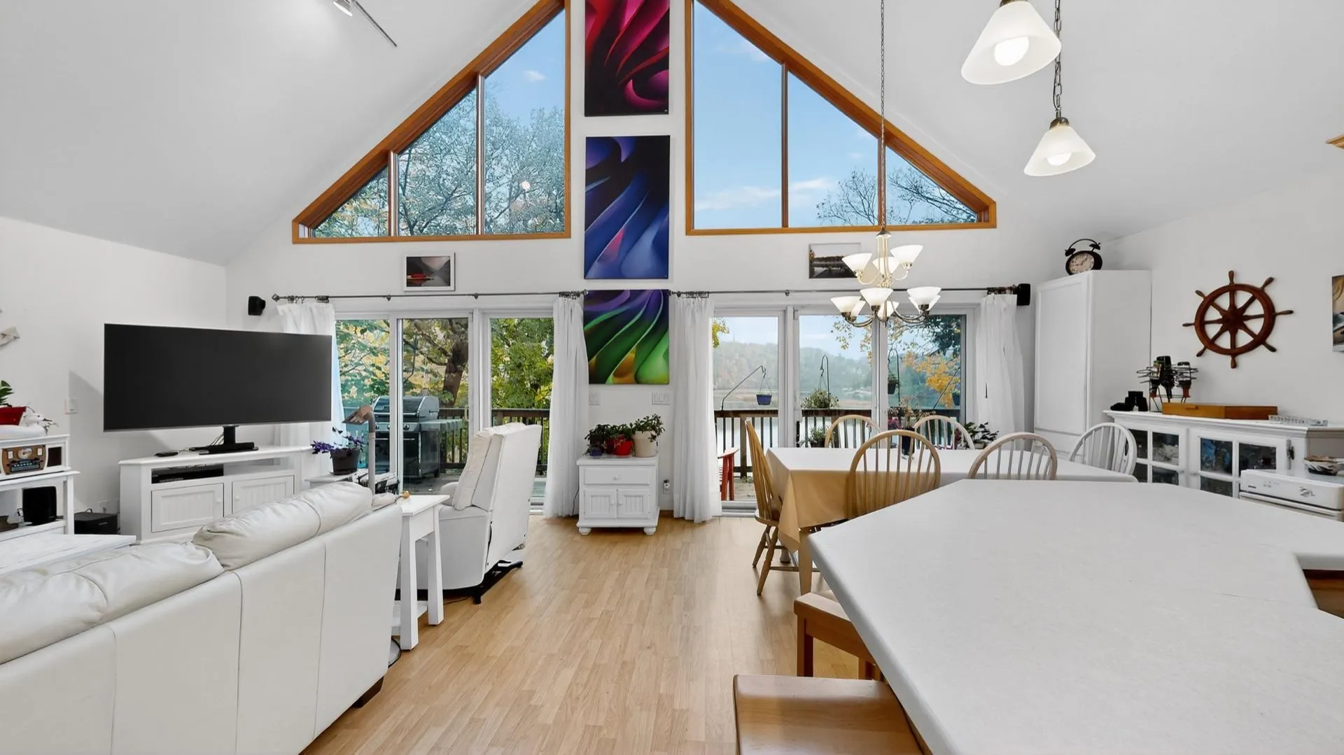 Enjoy stunning water views from this beautiful A-frame home featuring soaring ceilings, large windows, maple flooring, and double patio doors that bring the outdoors in. The open layout offers a bright living area with a stone fireplace, a spacious kitchen with hickory cabinetry, and a dining space that opens to one of three decks, perfect for relaxing or entertaining. For those toys, and hobbies the garage boasts 840 sq ft, with service doors to the side and rear yards. The main floor includes two bedrooms, a full bathroom with in-floor heating, and a convenient laundry area. A finished breezeway connects to the oversized two-car garage for added function and comfort. Upstairs, the loft provides extra living or sleeping space and hobbies. The lower level offers an egress window, recessed lighting, dual-fuel heating, in-floor heat, and a large utility room with storage. Outside, enjoy multiple decks leading down to the water and a permanent floating dock. This means that even as the river level fluctuates while you are away, the dock remains in harmony with the river. The three decks and views are relaxing, you feel surrounded by wildlife and natural beauty. This turnkey property requires little yard work, offering a vacation-home feel with main-floor living and space for guests. Additional features include a radon system, water softener, and quality craftsmanship throughout. Built 17 years ago, this home combines warmth, style, and lakeside serenity. Neighbors have community space they use for some parking, and if interested in more storage, there is a REMAX listing nearby to build an outbuilding. Listing number 6763574