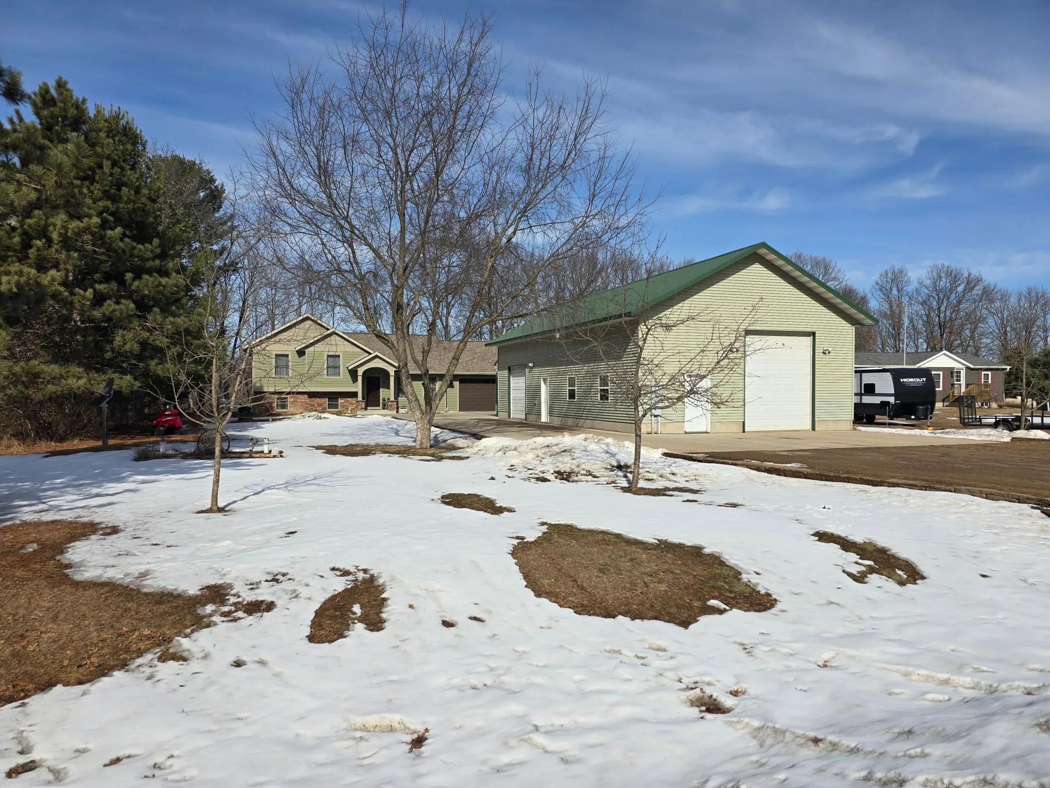 Better than new and in excellent condition, this impressive 4-bedroom, 3 full bath home offers the perfect blend of privacy and convenience with a peaceful setting just minutes from town and access to high-speed internet. Designed for both comfort and functionality, the open-concept kitchen, dining, and living areas create an ideal space for everyday living and entertaining, featuring granite countertops and beautiful hickory cabinetry—some custom-built by Larson’s Cabinets. Step outside to the 18×20 patio complete with a firepit area and rod iron fencing, perfect for pets, added privacy, and gatherings. The property also includes four Honeycrisp apple trees, adding charm and a seasonal bonus to the outdoor space. Car enthusiasts and hobbyists will appreciate the heated 30×54 workshop/3-car garage with 14×6 ceilings, a 10×14 loft area, a 10×14 office space, and an additional 10×24 lean-to with 9-foot ceilings. The home also includes a 1.5-car insulated attached garage with a floor drain. This property truly offers small-town living at its best with exceptional amenities throughout.