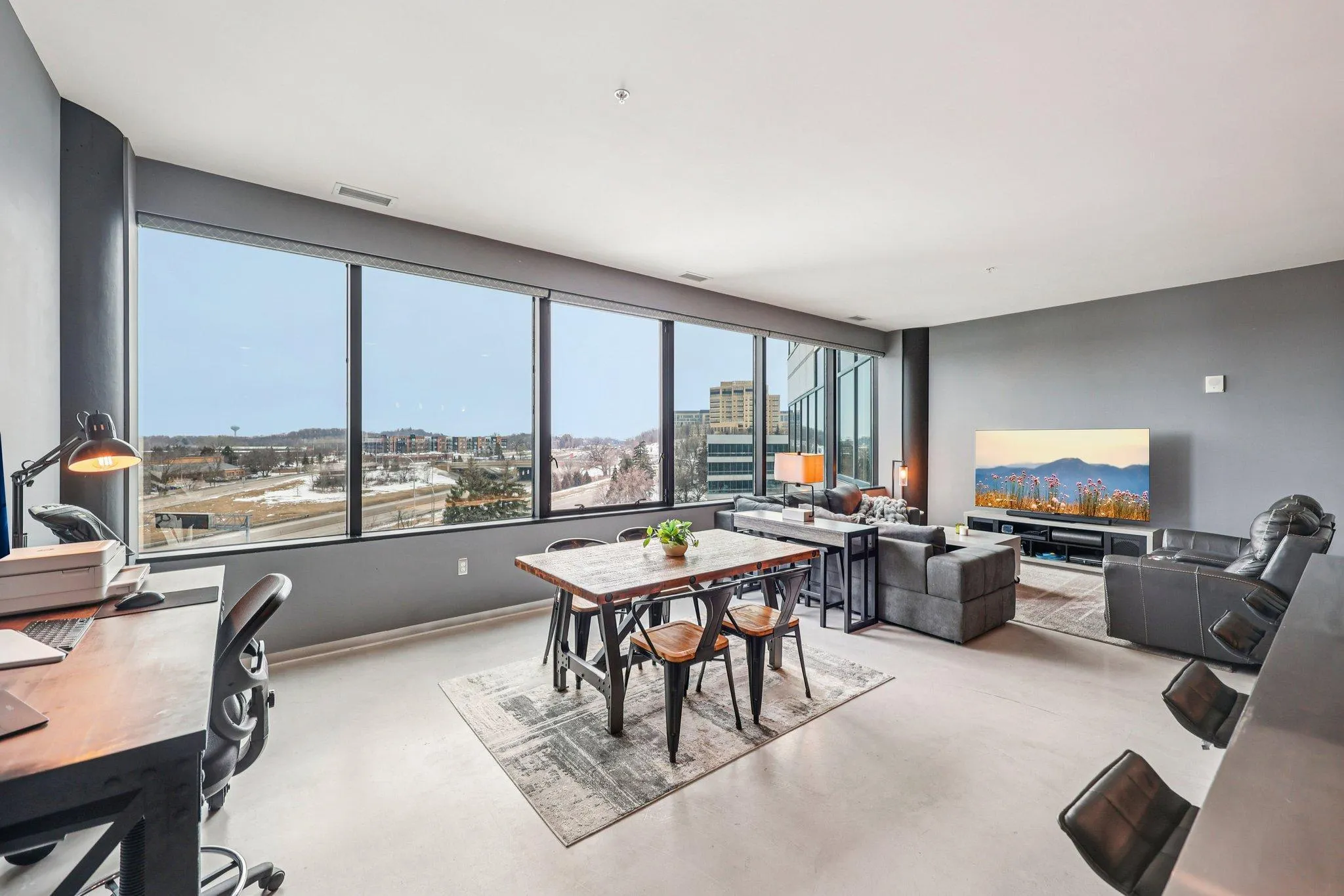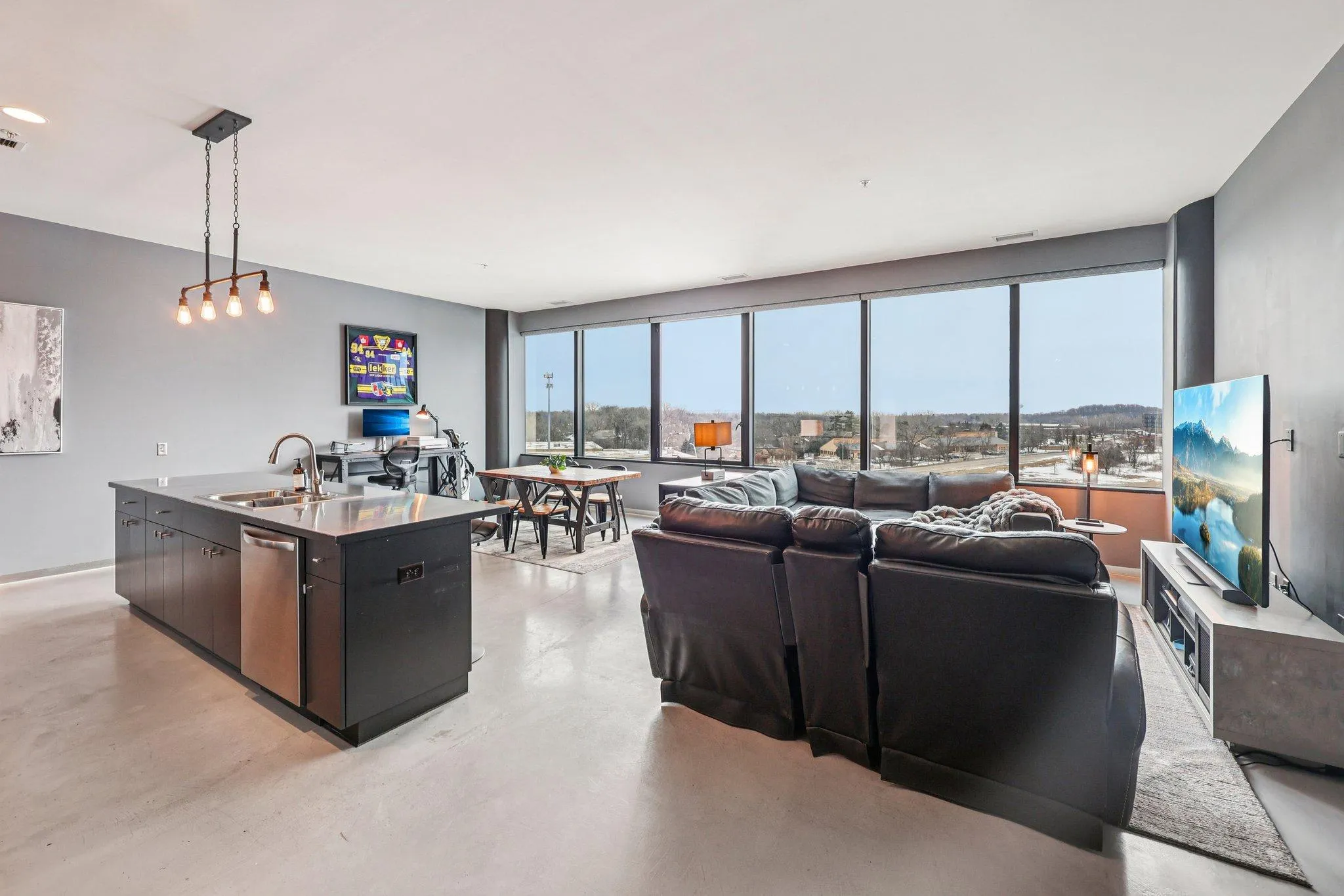Enjoy modern city living in this fifth-floor condo featuring 10-foot ceilings, an open-concept layout, and polished concrete floors for a clean, contemporary look. The kitchen offers stainless steel appliances and countertops, while a large storage room includes in-unit laundry. The spacious bathroom is designed for comfort with a double vanity, soaking tub, and separate shower, and the custom walk-in closet provides excellent organization. This unit comes with two spaces in a covered parking garage and a designated storage locker. The pet-friendly building includes two outdoor patios, a fitness center, bike storage, and onsite management. The association fee covers DirectTV, fiber optic internet, water, garbage, gas, lawn and snow care, hazard insurance, building amenities, and onsite management.