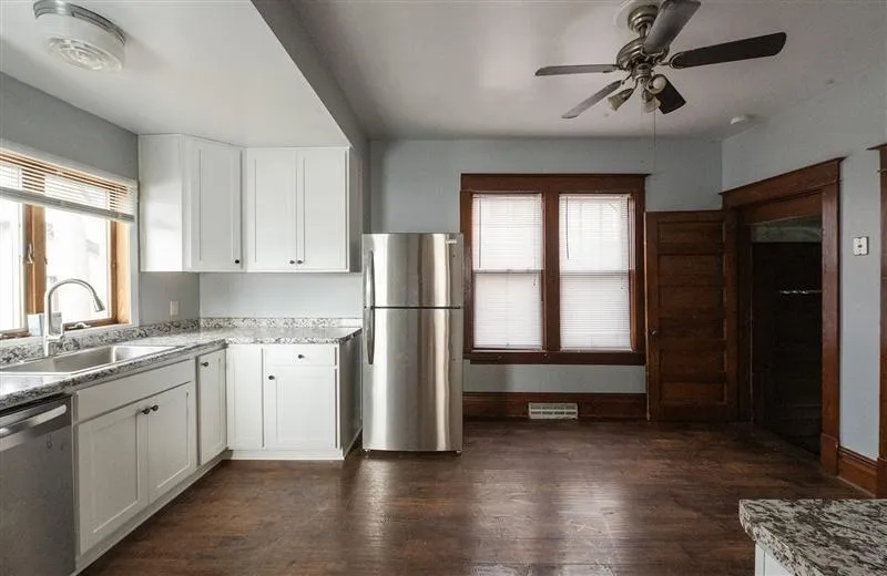 The large kitchen has been remodeled with new appliances. Tons of charm and character with fenced yard.
